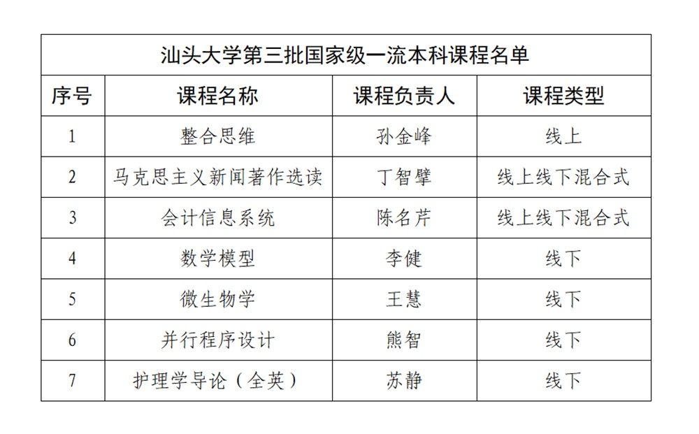 近日,教育部发布《关于公布第三批国家级一流本科课程认定的结果》(教高函〔2025〕9号),汕头大学7门课程获第三批国家级一流本科课程认定,涵盖线上、线上线下混合式、线下等三类课程类型。值得一提的是,在本次认定中,学校在国家级线上一流本科课程上取得了新突破。截至目前,学校在三批国家级一流本科课程认定中累计获批20门,实现五大类型全覆盖,课程建设成效显著。