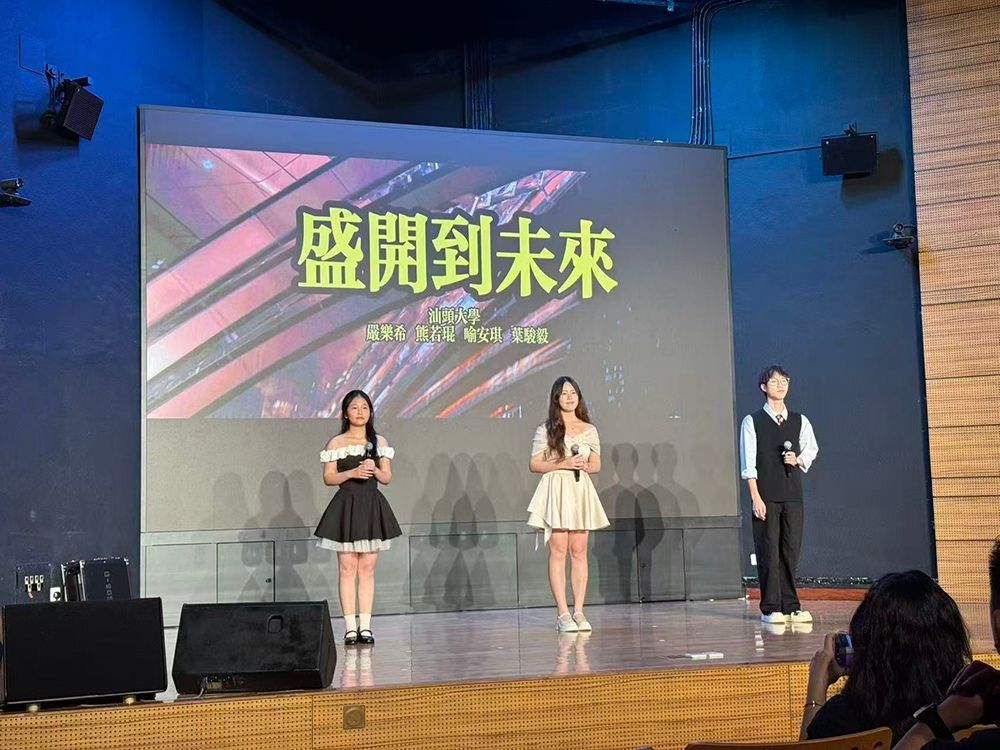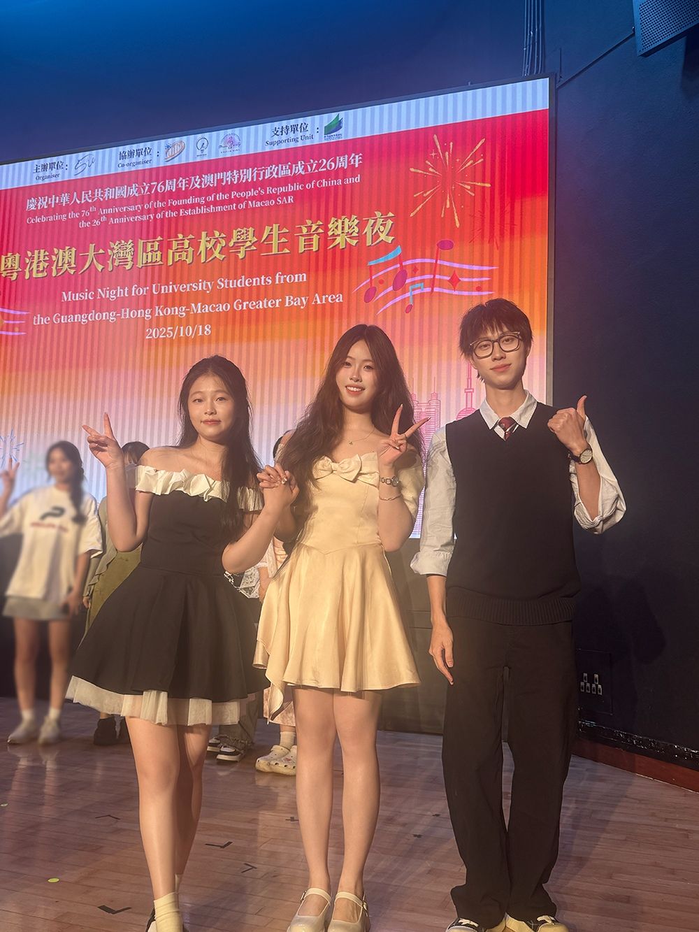 汕头大学受邀参演此次音乐盛宴。在艺术教育中心、港澳台事务办公室的精心组织与艺术教育中心樊建伟老师的指导下,派出严乐希、喻安琪、熊若琨三位同学赴邀,联袂献唱了中央广播电视总台为庆祝澳门回归祖国25周年特别打造的歌曲《盛开到未来》。舞台上,同学们以饱满的热情诠释作品内涵,用精湛的演唱技艺传递真挚情感。舒展明朗的旋律里,藏着对澳门未来的美好期许;字字铿锵的歌词中,展现出澳门同胞爱国爱澳、共建家园的共同愿景,更凝聚着湾区青年学子对祖国与澳门特别行政区的诚挚祝福。