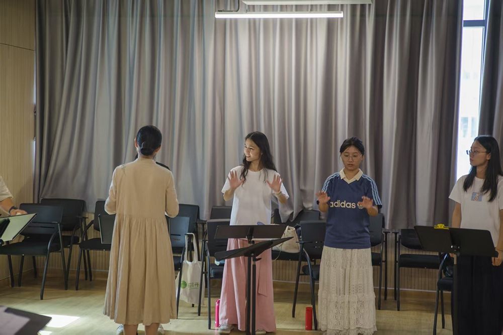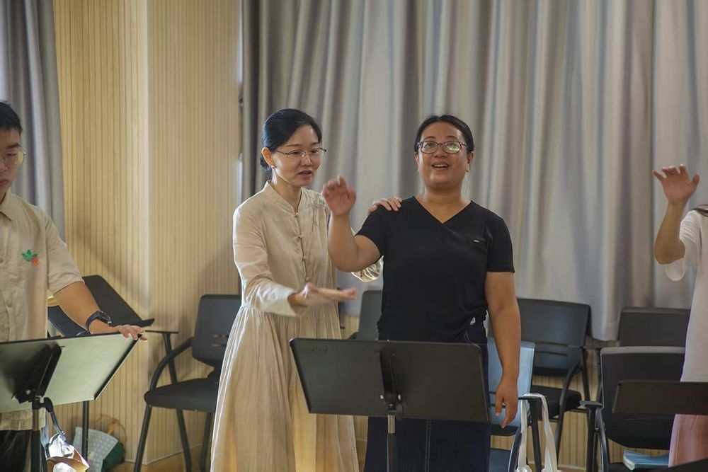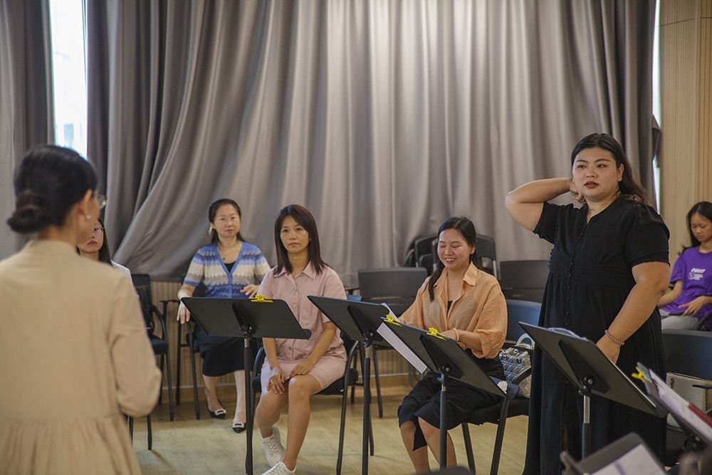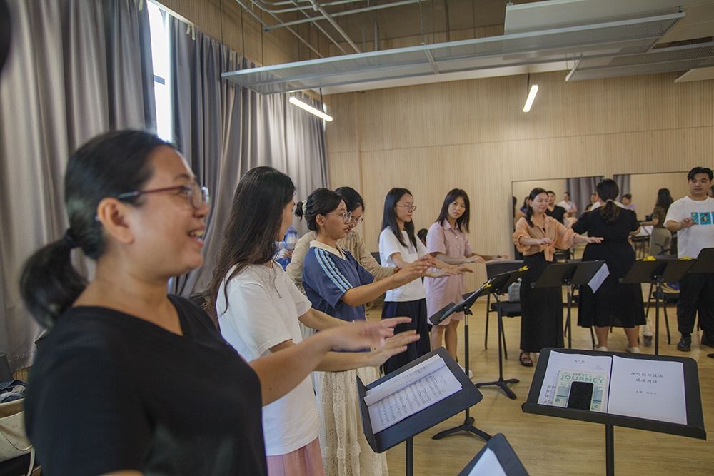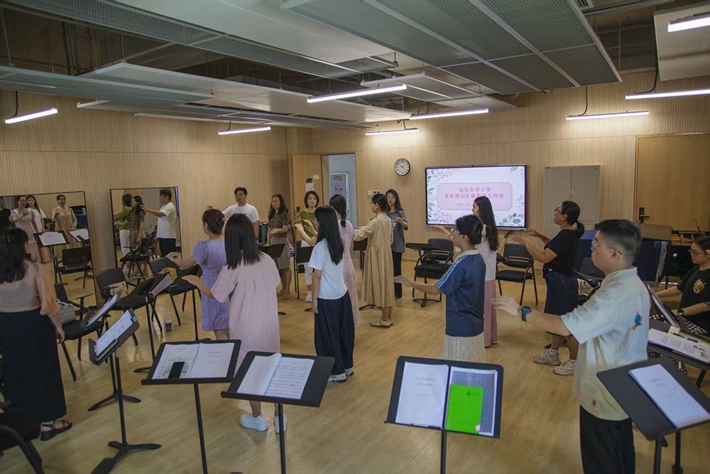 “排练要带着预判意识。”廖文兰结合合唱作品,引导教师分组分析:“要提前想到学生可能出现的问题,用观察解决问题,用步骤提升效率。”这种兼具理论高度与实践温度的指导,让老师们茅塞顿开。