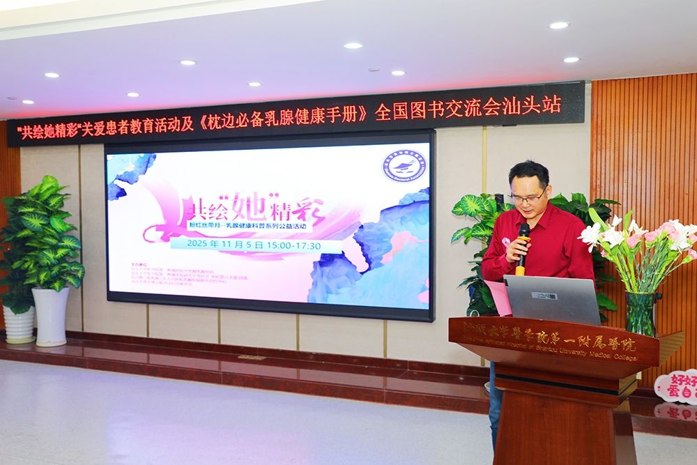 11月5日,“共绘她精彩”关爱患者教育活动暨《枕边必备乳腺健康手册》全国图书交流会汕头站举行。汕头大学医学院纪委书记黄谷子、附一院党委书记林枫、汕头市青年博士联合会会长王宋涛分别致辞,充分肯定甲乳外科在女性健康促进方面的努力与成果,呼吁社会各界共同关注乳腺健康,支持患者重返社会、重启精彩人生。交流会上,多位与会专家一齐开讲,内容涵盖疾病防治、营养支持、心理调适与康复锻炼。活动现场还设置了患友分享、医护表演等环节,气氛温馨而热烈。