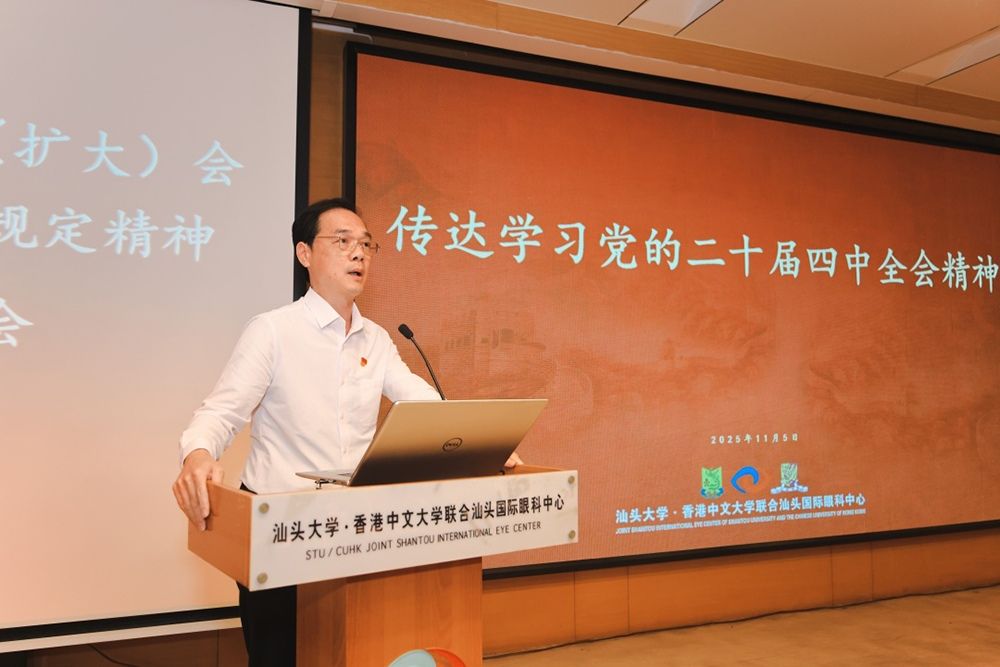 11月5日,汕头大学·香港中文大学联合汕头国际眼科中心(以下简称眼科中心)召开党委理论学习中心组(扩大)会,传达学习贯彻党的二十届四中全会精神。医院党政领导班子成员,各党支部书记,各职能科室、业务科室负责人参加会议。会议由纪检负责人黄育强同志主持。