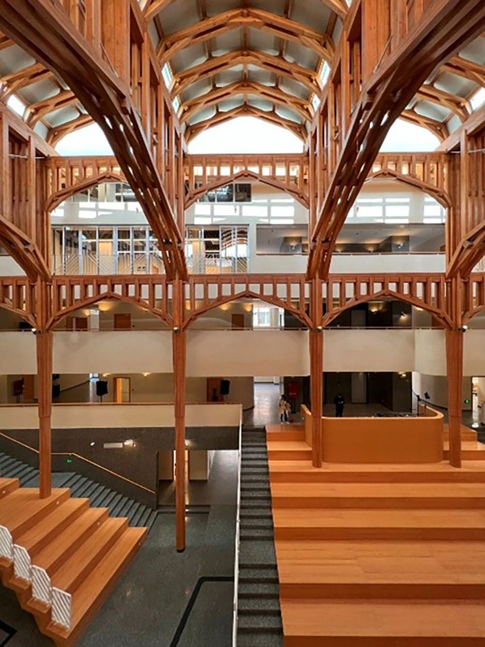 在上海交通大学设计学院大楼的改造中,阮昕将其重新定义为“城市家屋”。阮昕将其从普通的教学楼转译为具有文化厚度的“城市家屋”,通过围合布局与仪式感十足的木构穹顶,建筑成为了情感与记忆的容器。阮昕强调,大楼的核心在于“得体”——它以空间的温柔承接,“珍藏希望、庇护失望”,让师生在日常穿行中获得真实的归属感。