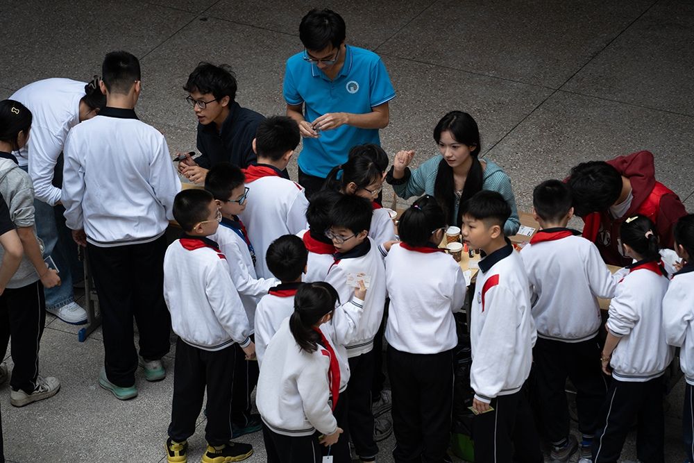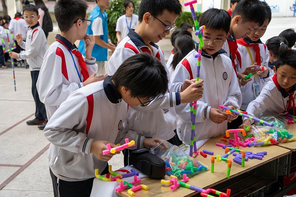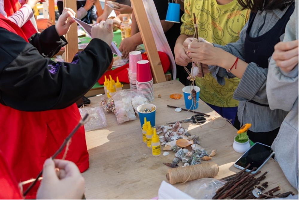 11月15日下午,桑浦山校区与东海岸校区同步开启校内专场。活动的四大特色环节亮点纷呈:“秋叶物语・花草书签”中,同学们甄选秋叶花草,将秋日韵味定格为专属书签;“风之絮语・环保风铃”里,瓶罐、纸片等废旧材料变身高颜值风铃,传递环保乐趣;“花语寄暖・手作传情”环节,扭扭棒化作永不凋谢的小花,承载真挚暖意;“两弹一星・砥砺前行”活动通过知识问答、卡纸写绘等形式,带领同学们重温奋斗岁月,厚植家国情怀。现场气氛热烈,同学们在动手创作中启迪思维、感悟深意。
