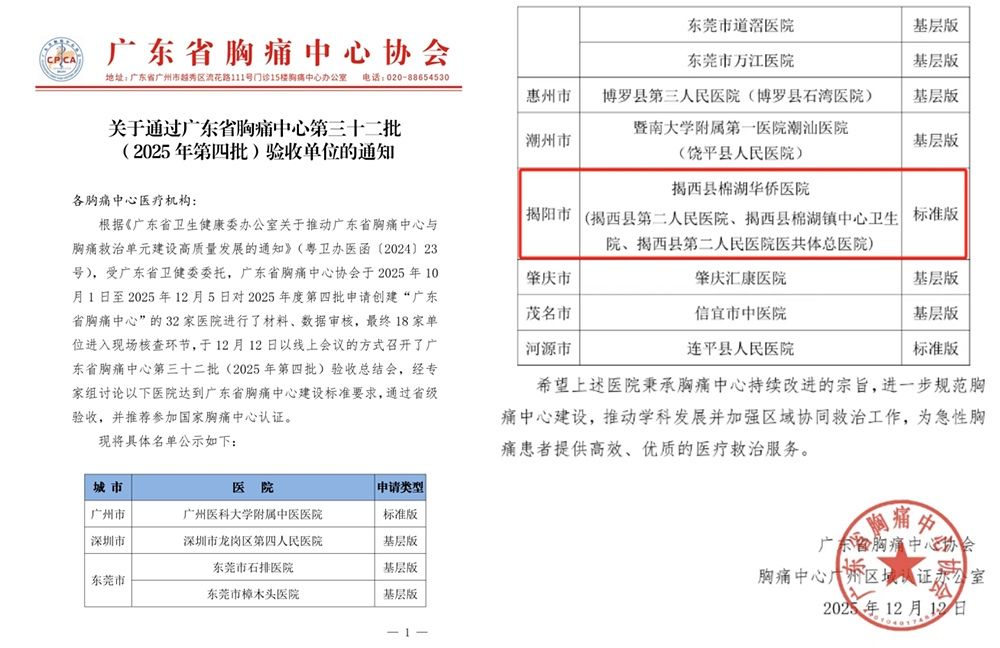 在广东省“双百行动”深入推进、助力“百千万工程”落地见效的关键阶段,传来重磅喜讯:近日,揭西县第二人民医院胸痛中心顺利通过广东省胸痛中心第三十二批(2025年第四批)现场核查验收,正式跻身省级胸痛中心行列。这一成果的背后,离不开汕头大学医学院第二附属医院(以下简称附二院)的精准帮扶与心血管内科副主任余伟的长期深耕,是优质医疗资源下沉、区域医疗协同发展的生动实践。