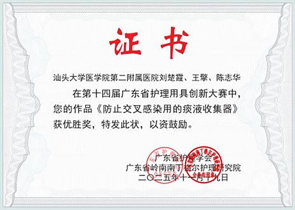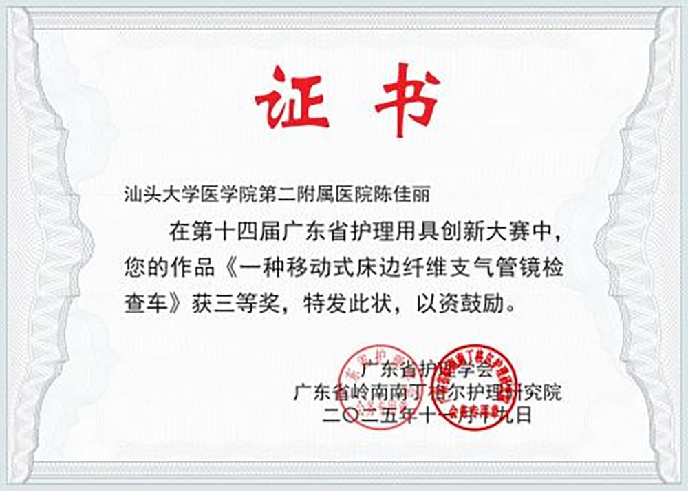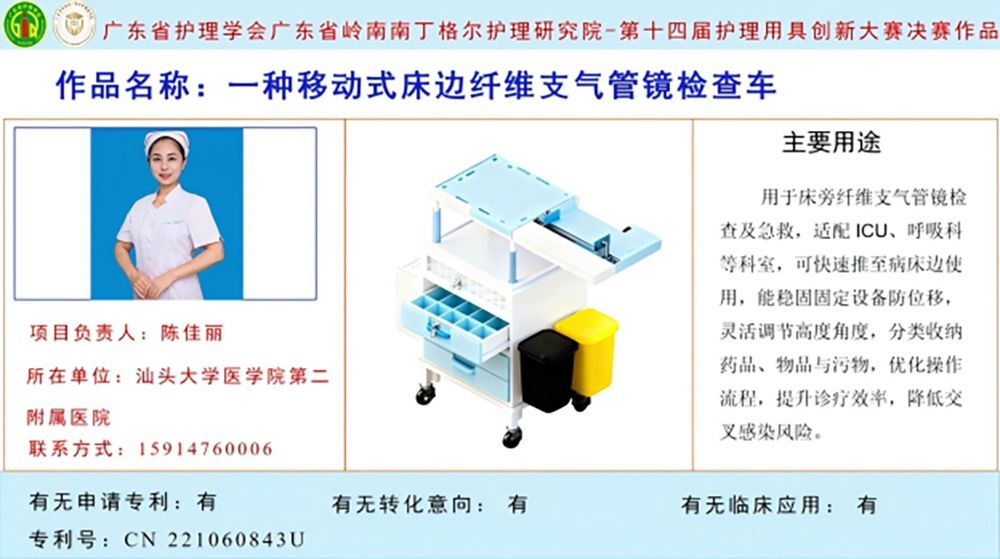 在第十四届广东省护理用具创新大赛中,附二院报送的两个项目从884个参赛作品中脱颖而出,喜获佳绩:呼吸与危重症医学科陈佳丽副护士长设计的《一种移动式床边纤维支气管镜检查车》荣获三等奖,该作品将被收录进入广东省岭南南丁格尔护理研究院创新档案成果库;感染性疾病科刘楚霞护士长带领王擎、陈志华团队完成的《防止交叉感染用的痰液收集器》获得优胜奖。