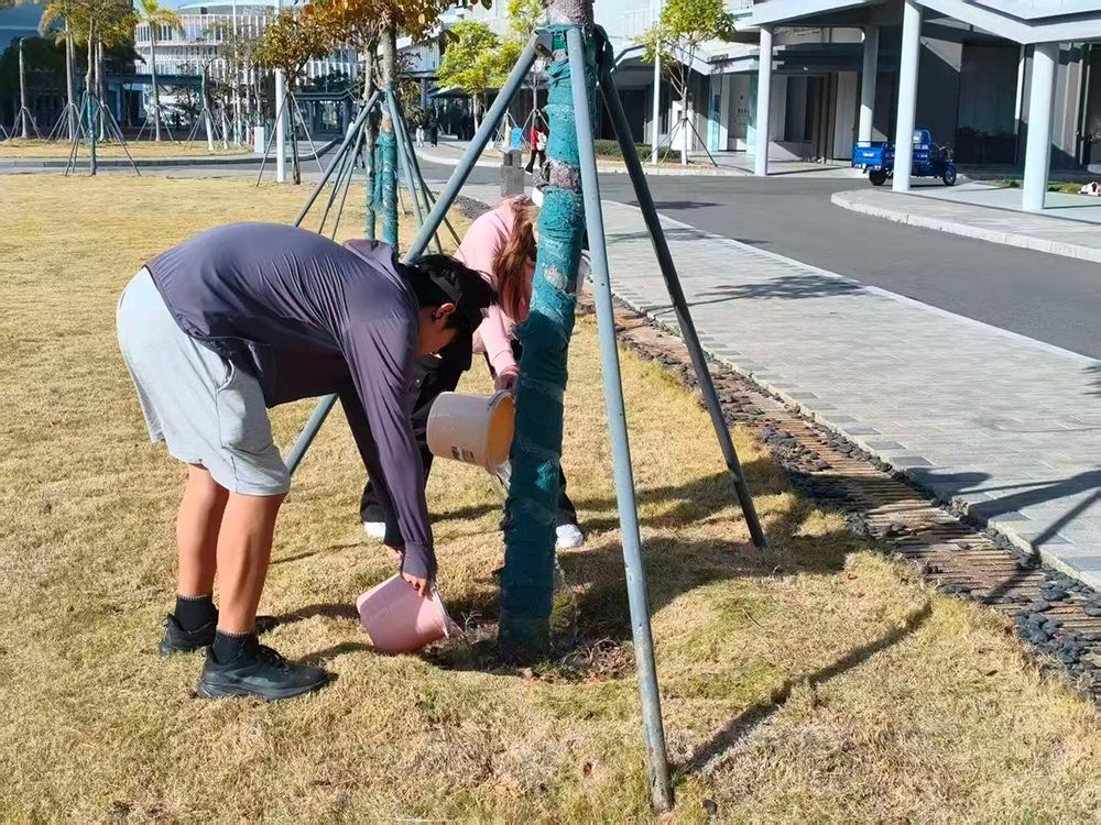 活动开展以来,各学院学生积极响应,依照提前划分的养护责任区,有序进行浇水、除草、施肥等基础养护工作。在物业园林工作人员的专业指导下,同学们操作规范、注重细节,自觉爱护绿化设施,严格遵守“不踩踏、不攀折”的文明准则,展现出良好的生态素养与协作精神。参与同学表示,亲手照料绿植,让他们深刻体会到“一草一木皆生命”的含义,对校园草木有了更深的情感,也增强了共建共享绿色和谐校园的责任感。