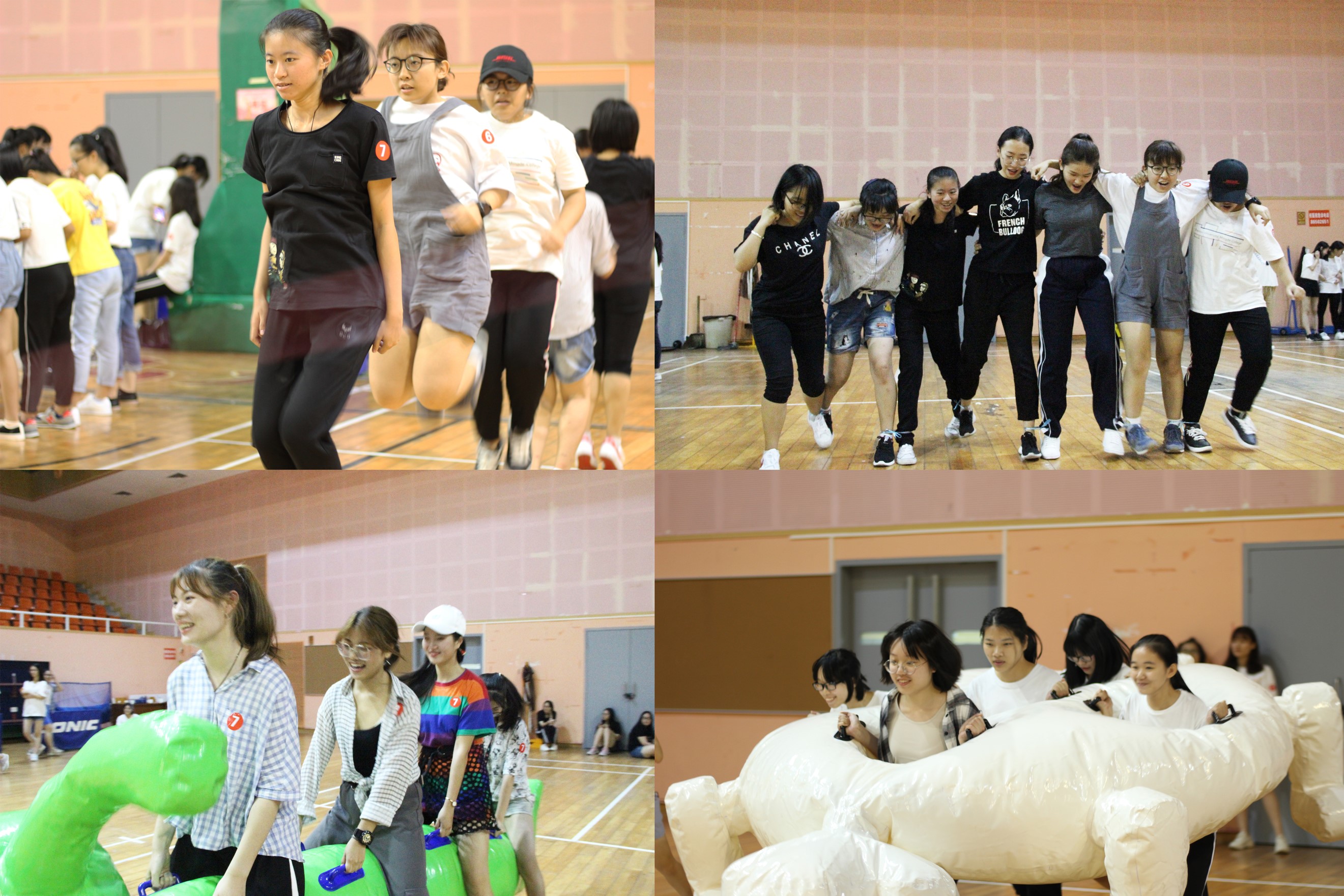 经过团队建设后,18级的新生们都卯足干劲、斗志昂扬。首先开始的是 “跳大绳”比赛,它是最考验团队默契度和反应能力的项目,在比赛中,同学们一次次试验着让大家能够保持同个频率,最终多个小组跳出了三十多次的记录。第二个项目是“七人八足”,它要求大家比赛时将脚绑在一起,肩并着肩,手挽着手,一起数着口号奔向终点,通过比赛让新生们迅速拉近彼此的距离。最后两个项目“毛毛虫奔跑”和“龟兔赛跑”,通过可爱的充气道具考验参赛者的默契与配合。比赛一开始参赛者同学们便“嗖”地一声冲到终点,但因道具阻碍跌跌撞撞,队员们都被自己踉踉跄跄的步伐逗笑,现场的气氛即紧张激烈又欢乐愉快。