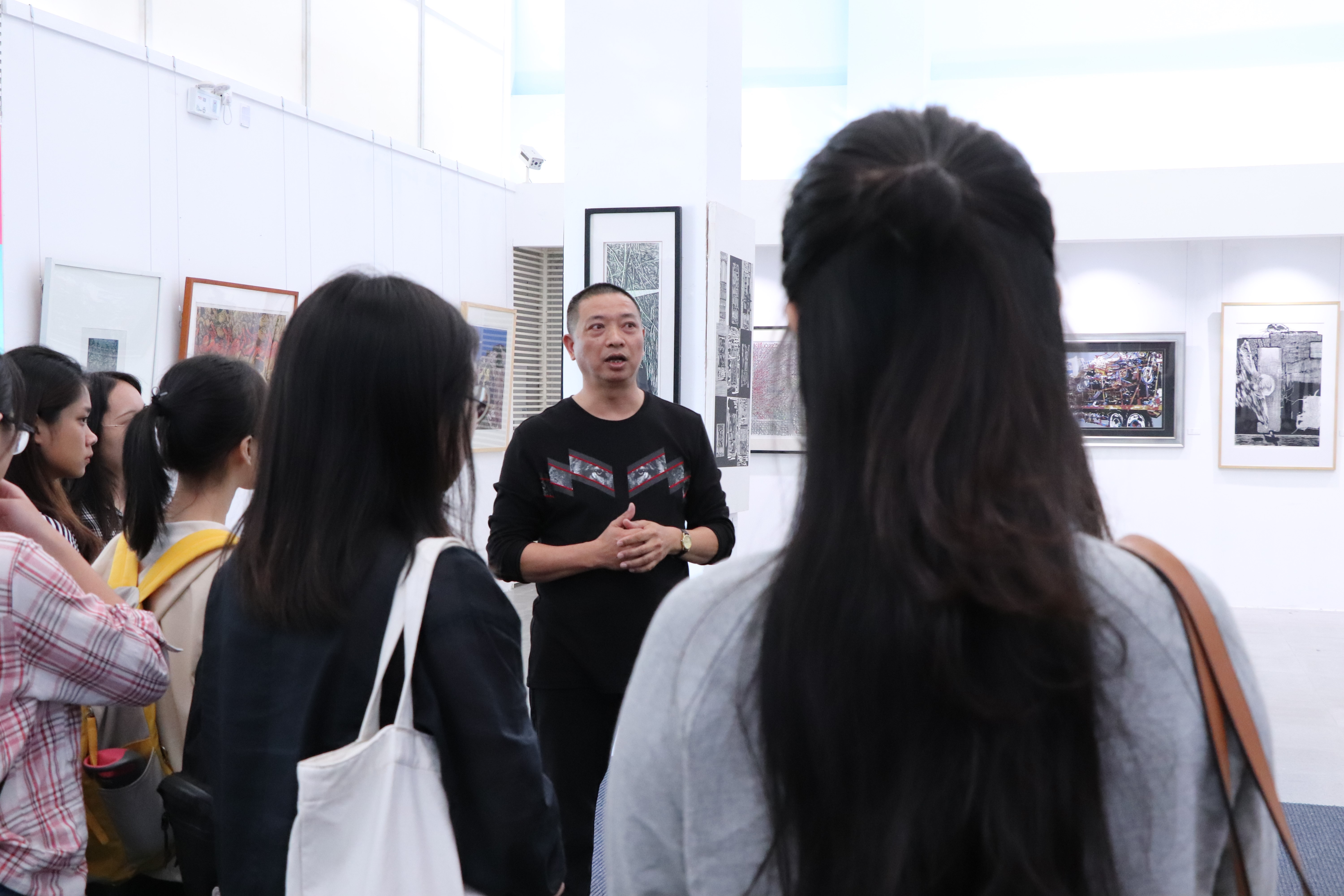 观展过程中,陈启胜老师向同学们介绍了布展的规律和细节,指引大家观展。同学们在观看版画原作的同时,学会了分辨不同类型的版画。“有用摄影转换过来的,也有纯手绘的”,陈启胜老师认真地给同学们解释。