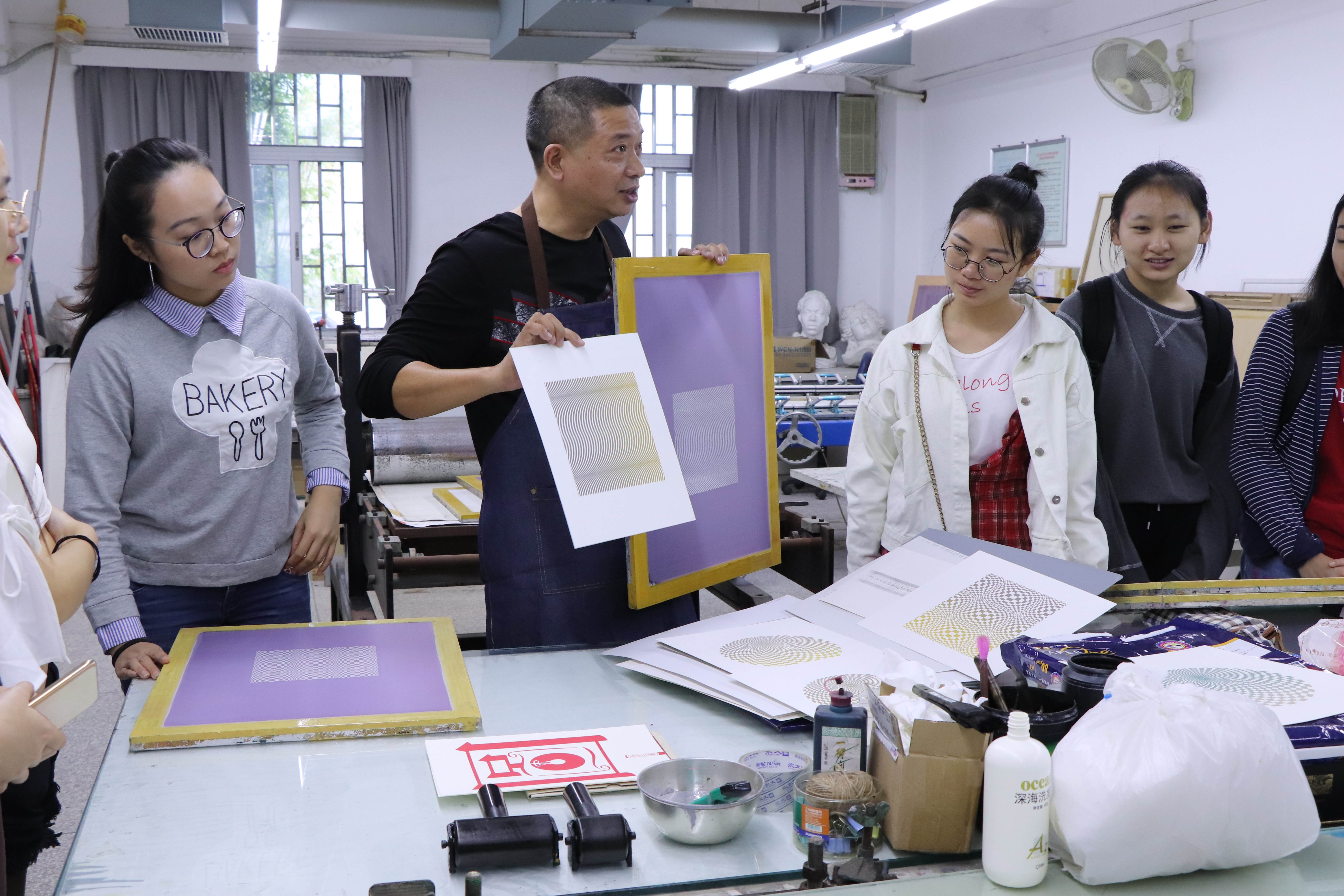 首先,陈启胜老师为同学们展示了汕头大学长江艺术与设计学院版画实验室的概况,比如平常上课的形式,学生制作版画的情景等。下一个部分是对版画的概述,在陈启胜老师的带领下,同学们对版画有了大致的了解,并做好了笔记,为接下来的欣赏活动做准备。接下来,同学们一起前往美术馆参观“新时代,新生活——潮汕版画20年”版画展览。