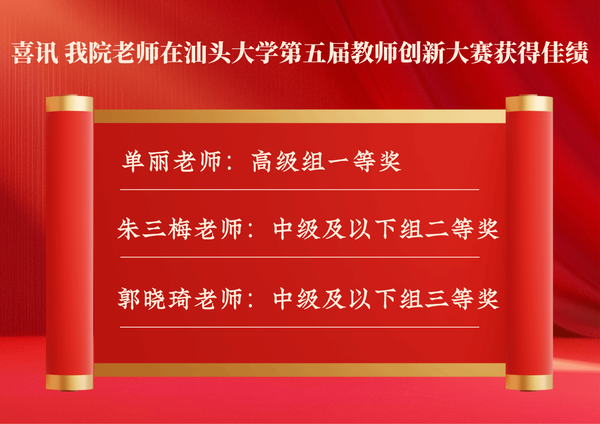 2025年12月20日,由汕头大学教师发展与教育评估中心联合校工会、教务处共同主办的第五届教师教学创新大赛现场决赛圆满落幕。赛事设高级组、中级及以下组(含新教师赛道)两大组别,我院精心选派单丽、朱三梅、郭晓琦三位教师参赛,与全校优秀教师同台竞技。