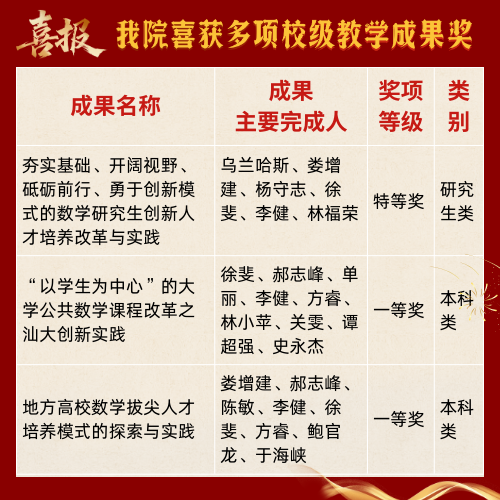 近日,广东省人力资源和社会保障厅、广东省教育厅联合印发《关于表彰全省学校(高等教育)优秀教学成果奖的决定》(粤人社发〔2025〕47 号)。我院申报的教学成果在激烈的省级评选中脱颖而出,斩获颇丰,尽显育人实力!更值得庆贺的是,我院郝志峰教授作为成果第一完成人申报的教学成果《多元协同・机制迭代:先进本科教育引领拔尖创新人才培养的探索与实践》,凭借其创新性与实践价值,荣获本次省级优秀教学成果特等奖,为学院再添重磅荣誉!