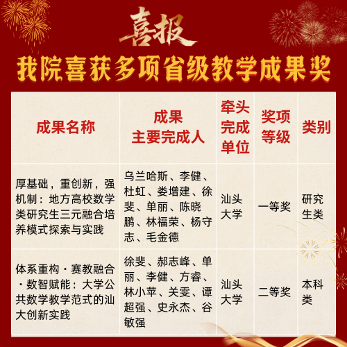 未来,我院将以获奖为新起点,坚守立德树人根本,深化教改、推广优秀经验,优化课程与教学,为汕大高水平大学建设及国家教育事业进步贡献力量!