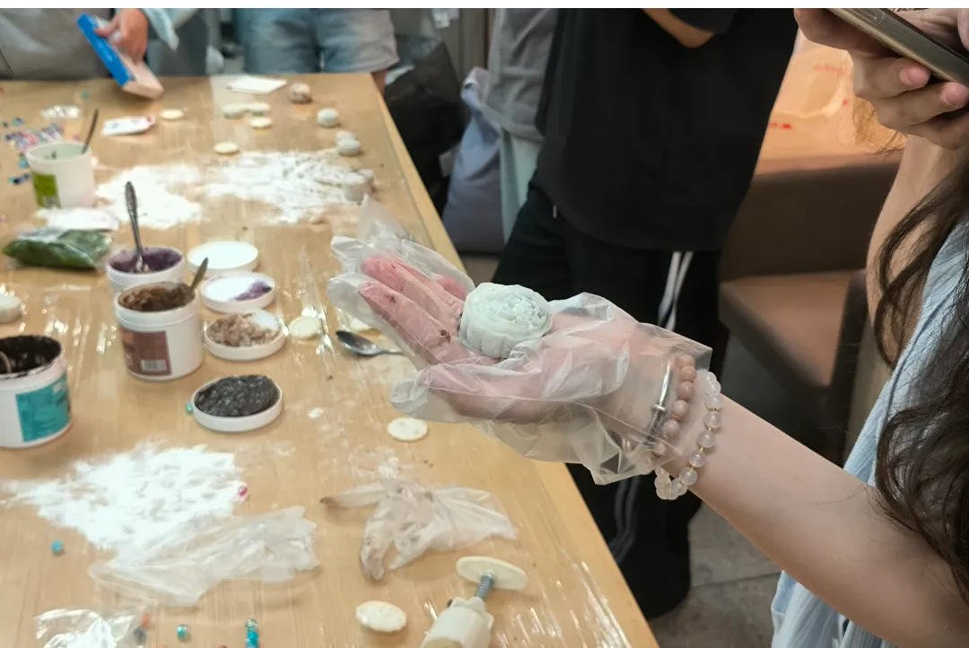 在冰皮月饼DIY活动现场,导生会工作人员为同学们分发馅料、模具和一次性手套等工具并现场示范制作步骤,帮助同学们快速掌握制作技巧。同学们兴致勃勃地投入手作环节:取适量冰皮面团揉匀,将各类馅料仔细裹入其中,再放入模具轻压定型,一枚枚花纹精致、边缘齐整的冰皮月饼便新鲜成型。揉捏过程中,冰皮散发的淡淡米香与各类馅料的独特风味相互交织,沁人心脾。不少同学完成制作后即刻品尝,Q 弹凉爽的冰皮搭配香甜软糯的内馅,口感丰富层次分明,引得现场好评不断。暖黄的灯光下,月饼的香气与欢声笑语萦绕全场,浓厚的中秋氛围感染着每一位参与者。