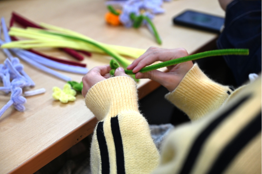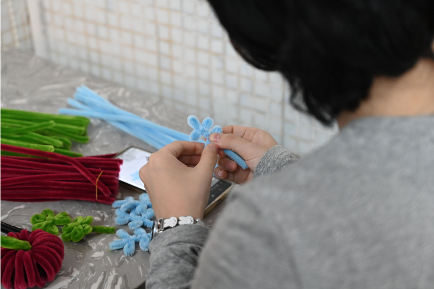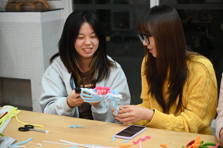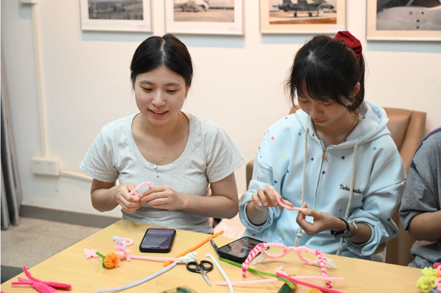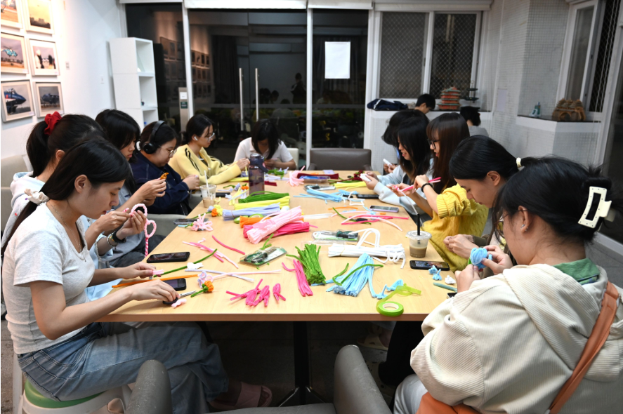活动伊始,主讲人对扭扭棒的材料特性、基本技法以及创作思路进行了细致讲解,从简单的弯折与缠绕技巧,到色彩搭配的美学原理,基础技法的传授为同学们提供了创作的起点,激发了内心深处的想象力与创造力。讲解环节结束后,创意工作室瞬间化身为一个充满活力与创造力的艺术工坊。同学们纷纷挑选心仪颜色的扭扭棒,在指尖的扭动、缠绕与拼接中,将天马行空的想象逐步变为现实。创作过程中,温馨互助的场景成为活动的亮丽风景。