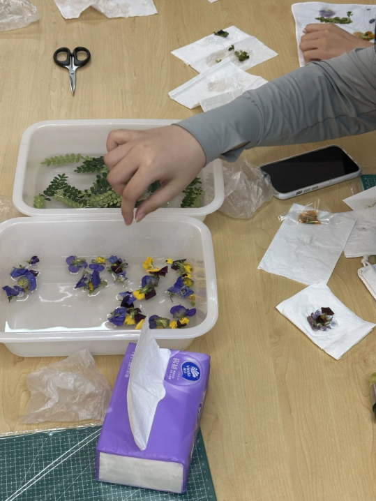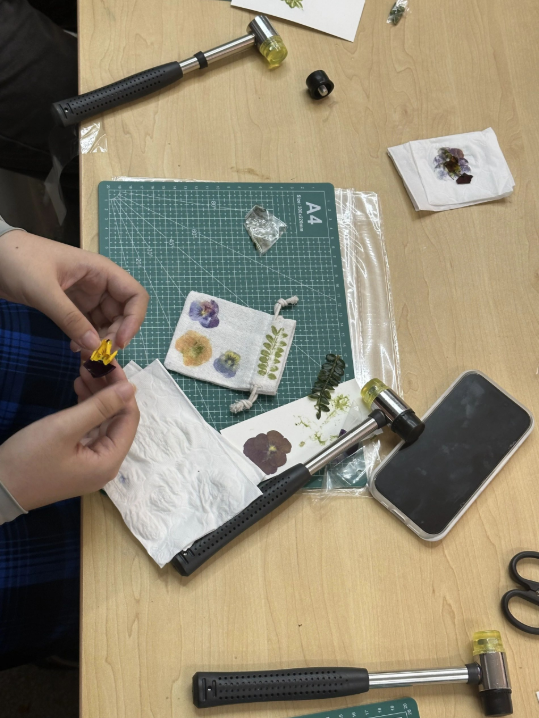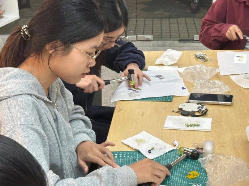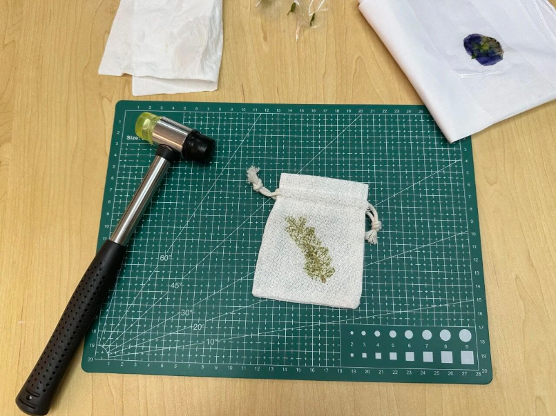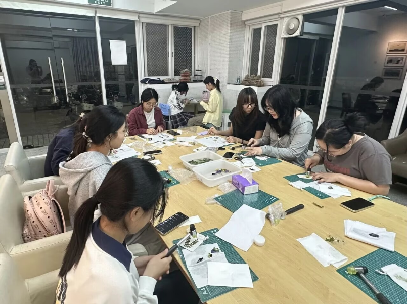 开始阶段,主讲人细致讲解了关于植物拓染的选材技巧、构图要领与敲拓手法。同学们领取工具材料后迅速投入创作,工作室里逐渐形成一片忙碌而有序的景象:有人俯身比对叶脉走向,有人轻敲布料凝神观察色彩渗透,细碎的敲击声与不时的轻语交织,勾勒出沉浸式实践的生动画面。