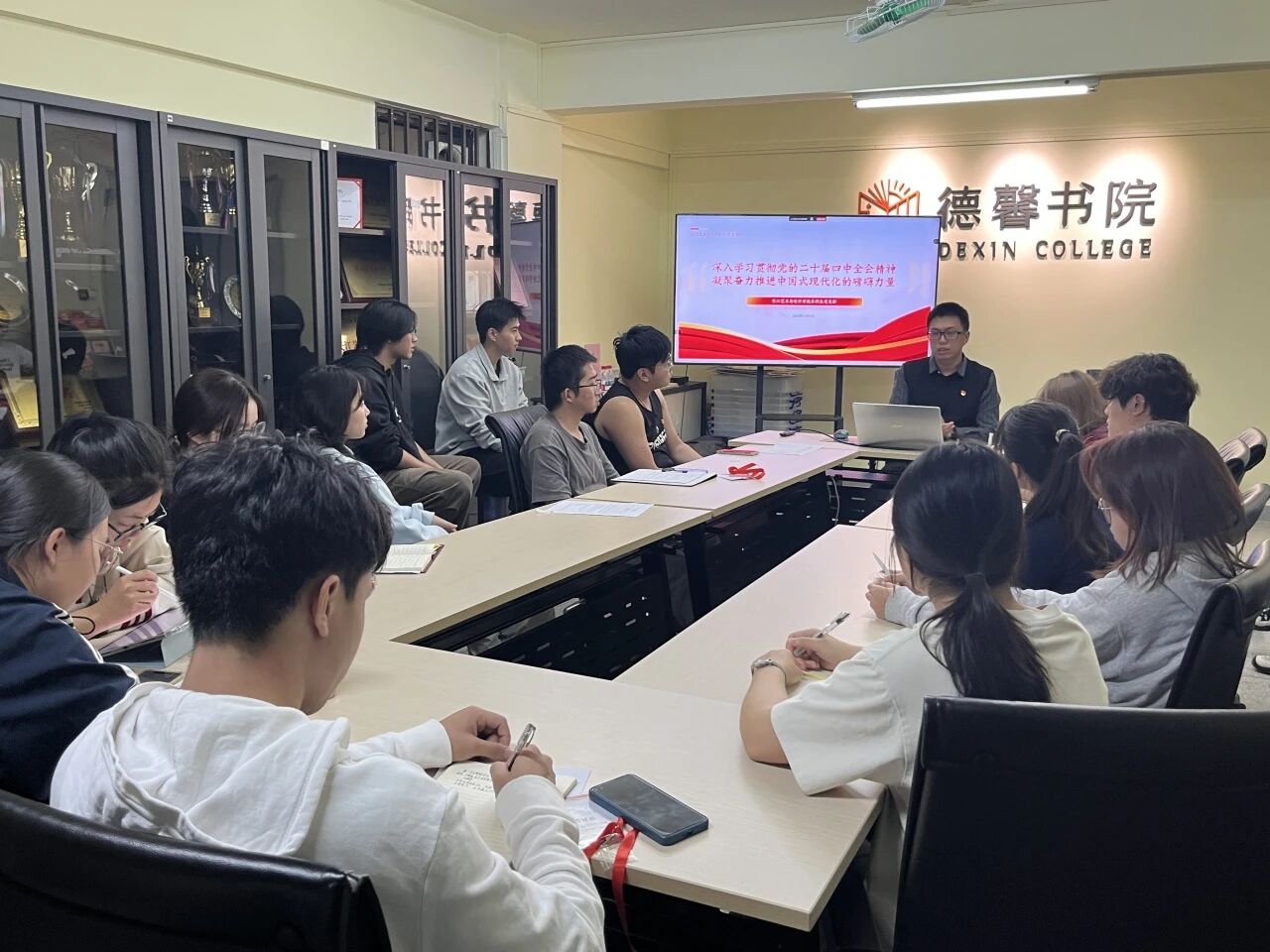 12月2日晚,学院团委马泽雄老师在德馨二楼会议室开展了以“深入学习贯彻党的二十届四中全会精神,凝聚奋力推进中国式现代化的磅礴力量”为主题的专题学习。马老师结合自身实践经历,介绍“十五五”规划与青年学子的联系,强调关注“十五五”就是关注未来的人生前景,参与“十五五”就是书写自己的人生篇章。他指出,作为艺术学子,我们需要增强对“十四五”发展成就的认同,按照新趋势新部署补强新知识。比如,在艺术创作中主动融入社会主义核心价值观和中华优秀传统文化,拥抱人工智能,用AI等新技术赋能艺术设计;通过积极参与“美育浸润行动”“百千万工程”,深入了解群众需求等等。最后马老师勉励大家,努力成为既有专业技艺、又有家国情怀的新时代艺术工作者,在推进中国式现代化的征程中贡献自己的青春力量。