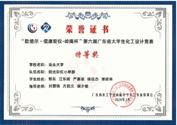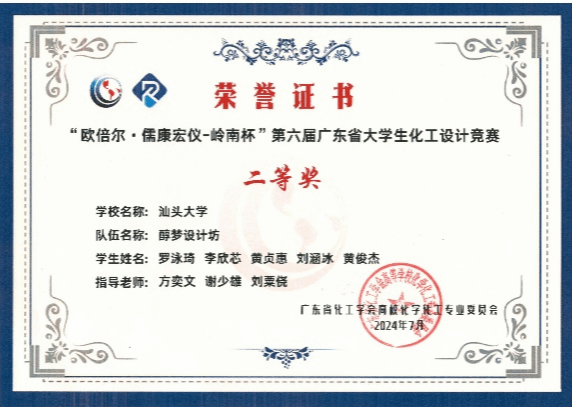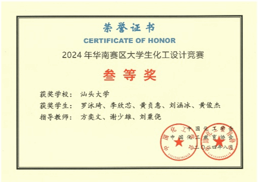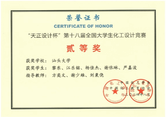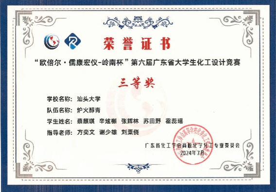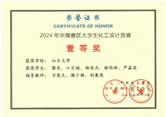2024年8月6日,由中国化工学会和中国化工教育协会主办,湖南工程学院承办的第十八届全国大学生化工设计竞赛华南赛区决赛在湘潭落下帷幕。由化学化工学院同学组成的“阳光彩虹小单醇”队代表汕头大学参赛。经过作品评比和现场答辩的激烈角逐,“阳光彩虹小单醇”队以优异的成绩获得赛区一等奖,全国二等奖。