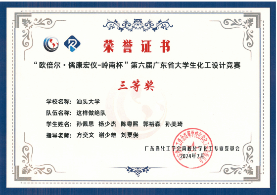 值得一提的是,在七月下旬举办的第六届广东省大学生化工设计竞赛中,我院还取得了1项特等奖,1项二等奖和2项三等奖的优异成绩。