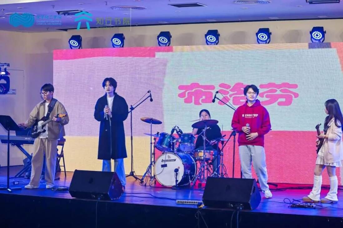晚会以布洛芬乐队的摇滚旋律震撼开场。两首歌曲《静止》与《明天你依旧在我身旁》接连奏响,激昂的鼓点与电吉他的音浪瞬间点燃全场气氛,展现了青年学子蓬勃的朝气与不羁的音乐热情。