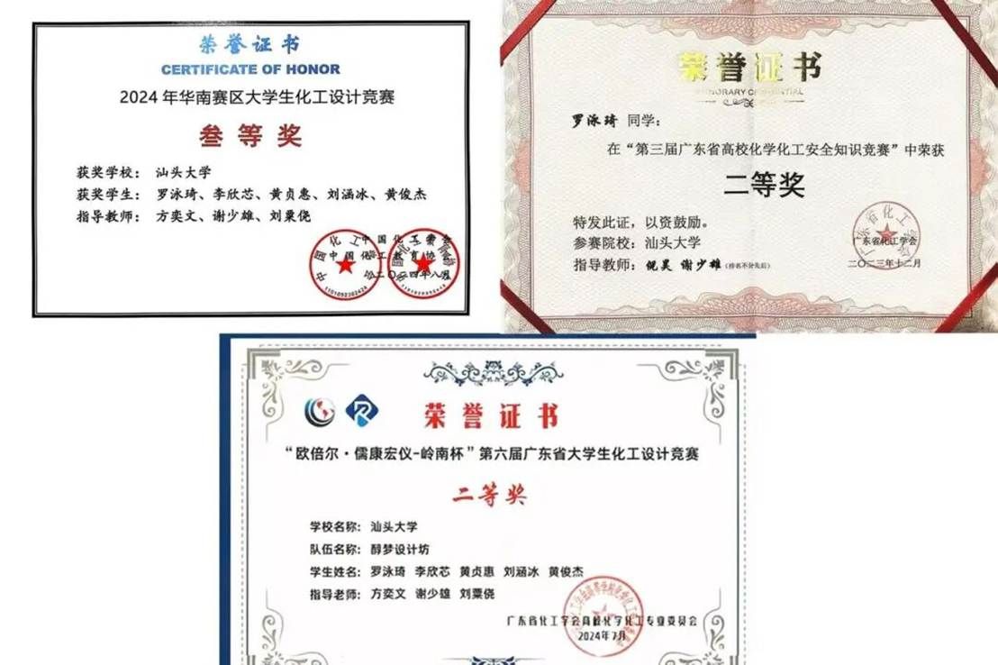 在大二时,她了解到一些保研的相关政策,意识到除了成绩以外,科研竞赛对保研同样重要。于是,她开始主动争取机会,跟随师兄师姐参加广东省化学化工安全知识竞赛。即便面对需要从零开始学习的化工设计竞赛,她也积极参与,和队友们没日没夜地梳理流程、处理报错、计算校核、整理文档,最终仅获得“华南区赛三等奖”,但她并未感到遗憾。能在竞赛中结识诸多师兄师姐与同辈,和队友朝着同一目标全力拼搏、交出满意答卷,过程虽辛苦,回想起来却满是美好。每一次竞赛都是一次宝贵的经历,这不仅是挑战自己的舞台,更是一个能将所学转化为解决实际问题的机会。从紧张的备赛环节到赛场上的全力以赴,在这个过程中,她学会了如何在压力中保持冷静,如何通过所学到的知识独立思考解决问题。每一次参赛,无论成绩如何,都是对自我的成长和超越。在竞赛中,她不仅获得了奖项,还赢得了无数宝贵的经验以及友谊。