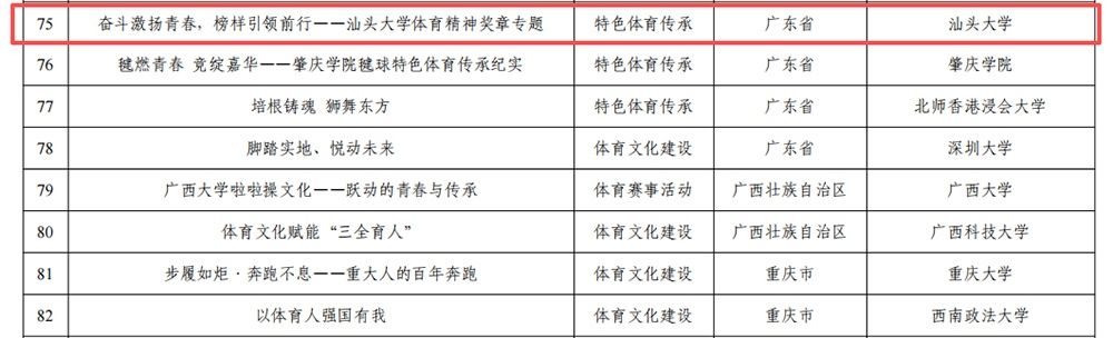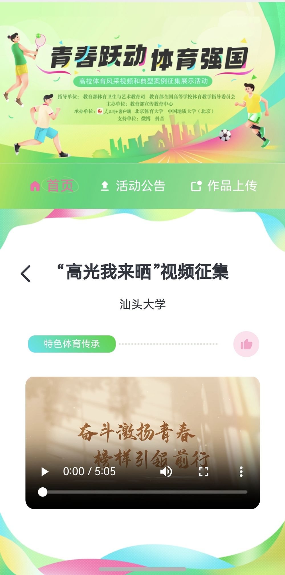 近日,教育部宣传教育中心公布了高校体育风采视频和典型案例名单,汕头大学报送的《奋斗激扬青春,榜样引领前行》被评为优秀视频作品,在“人民网+”客户端、人民日报少年客户端集中展示。