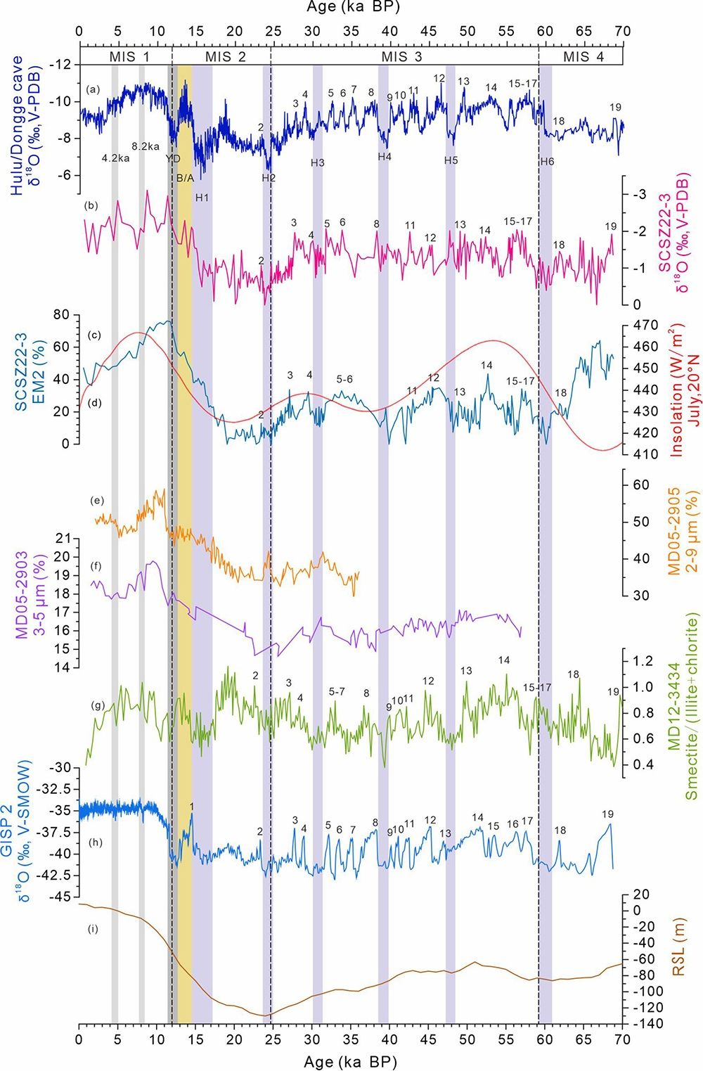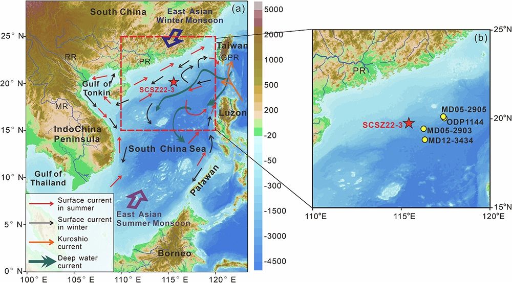 南海作为亚洲重要的边缘海,其沉积记录对于理解东亚季风演变具有重要意义。本文基于南海北部SCSZ22-3孔沉积物开展沉积学、年代学和同位素地球化学系统分析,识别出7万年以来的碎屑物质主要来自台湾西部、吕宋岛和华南地区;通过高分辨率粒度端元分析,提取EM2组分为替代指标重建了东亚夏季风演变过程,其显著的D-O旋回和H事件特征指示东亚季风对高纬度冰盖变化存在响应;频谱分析进一步揭示EM2变化包含18.7 ka岁差周期、11.7 ka半岁差周期以及5.9 ka、2.3 ka、1.2 ka等半轨道周期,表明东亚夏季风演化同时受到低纬度热带过程与高纬度冰盖变化的共同影响。本文为深入开展千年尺度晚第四纪东亚季风演变的驱动机制研究提供了可靠的沉积记录证据。