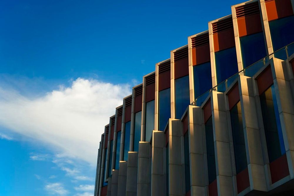 东海岸校区图书馆设计采用开放智慧环、恒动知识轮的创意理念——整体造型如同智慧之环降落在草坡之上,韵律化的立面百叶好像被海风吹拂的书页,徐徐翻动;又犹如错动咬合的知识齿轮,成为恒动不止的校园智力引擎。圆形体量之下为方形的二层草坡平台,提供了休闲聚会的场所,草坡下为共享学习中心,是自主学习时代的新型场所。其布局理念,亦符合中国古代传统哲学思维——“天圆则产生运动变化,地方则收敛静止”。
