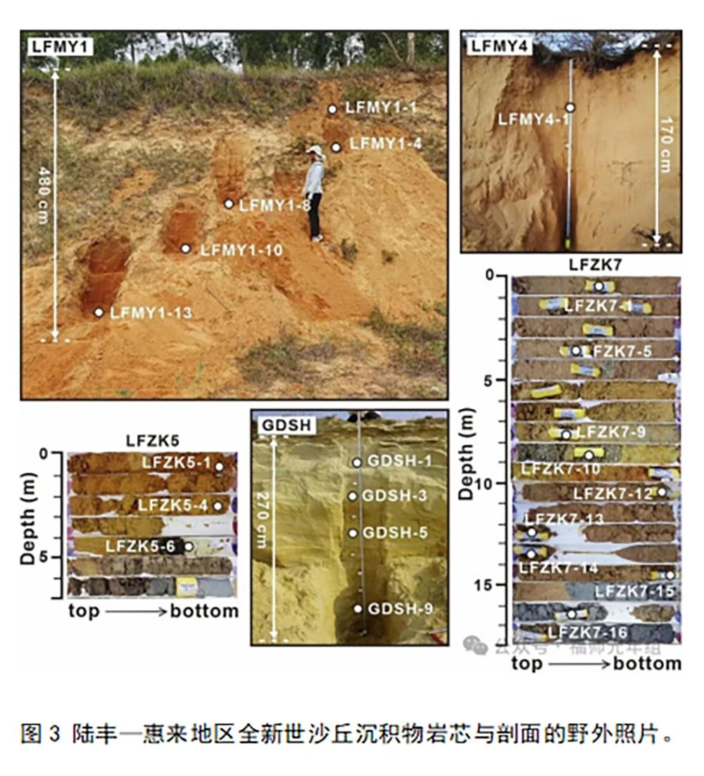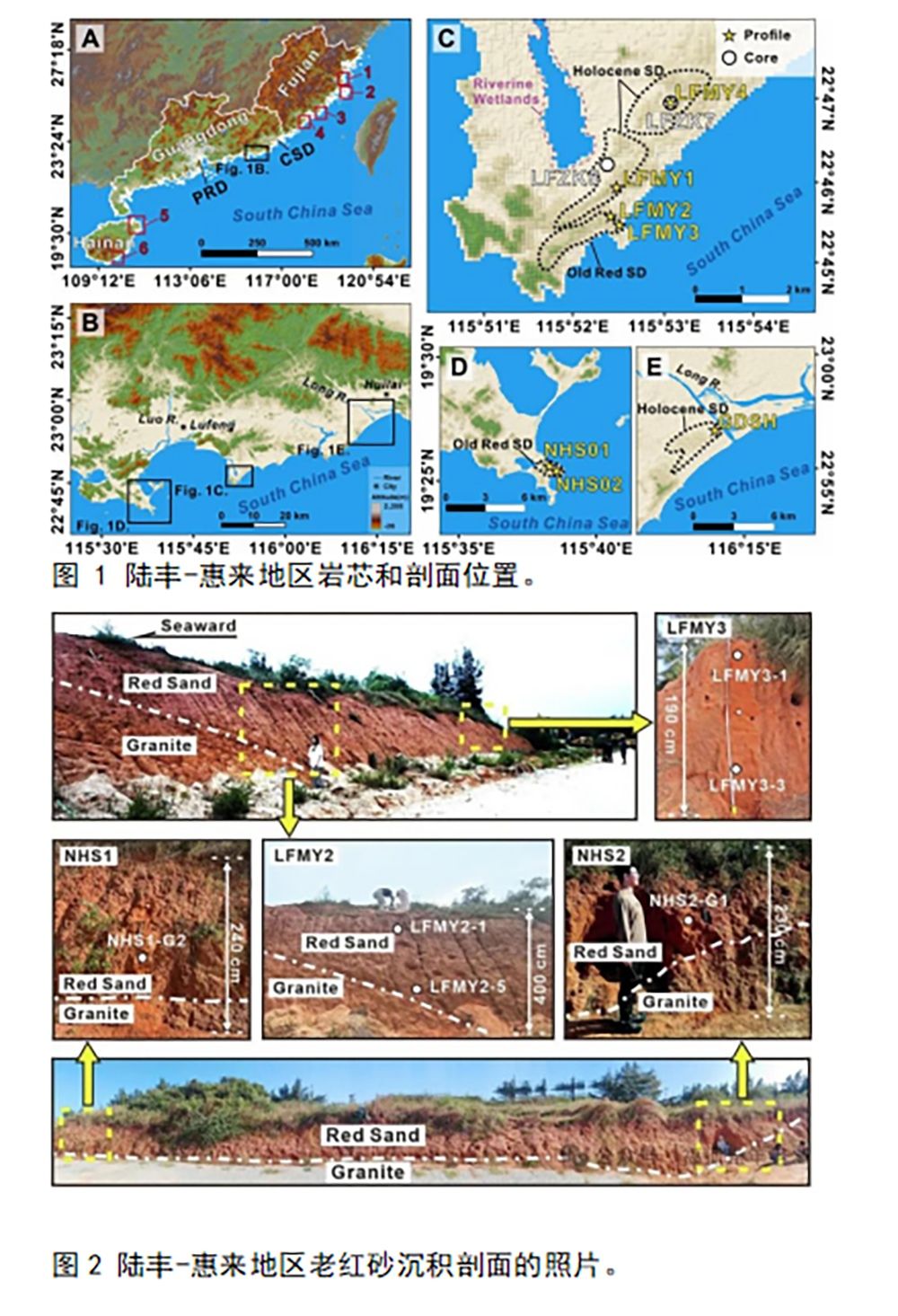 广东省有长约4300公里的海岸线,其海岸沙丘沉积记录对于重建全新世以来的海岸环境变化与人类活动影响具有重要意义。然而,目前对于这些海岸沙丘沉积序列的精确定年及成因机制,特别是其区域差异性和形成驱动力,仍缺乏系统、深入的认识。本研究在广东东部陆丰—惠来地区的沙丘进行了钻探、野外采样及光释光(OSL)测年、矿物颗粒形态分析的工作。研究结果表明:(1)广东海岸老红砂的OSL测年结果显示其形成于海洋氧同位素5阶段(MIS 5)。(2)对南海东北部沿海地区已发表的169个全新世沙丘年代数据(包括已发表的147个和本研究的22个OSL年代)的综合分析揭示了该地区沙丘沉积的三个主要阶段:分别为12–5 ka、4–2.5 ka和1.5–0 ka。(3)气候和人类活动影响了全新世海岸沙丘的形成过程。该成果为深入理解华南沿海地貌演化及其驱动机制提供了重要年代学证据。