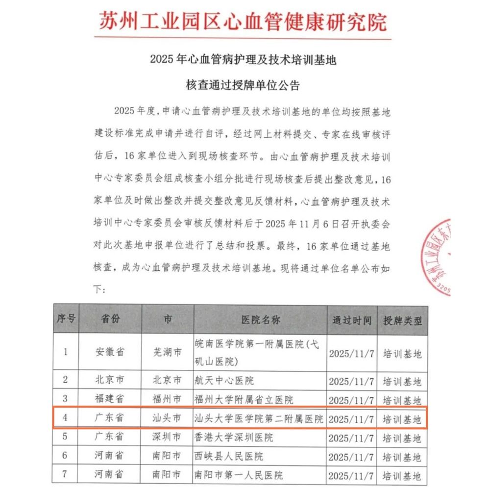 硕果盈枝,捷报频传!继汕头大学医学院第二附属医院(以下简称附二院)成功获批广东省“胸痛护理”“心血管高级实践护理”“心脏康复护理”三大专科护士培训实践基地后,近日,医院心血管内科护理团队再传喜讯——顺利通过国家心血管病护理及技术培训中心的严格核查,正式获批国家级“心血管病护理及技术培训基地”。这是附二院护理学科在专科建设领域实现的又一次突破。