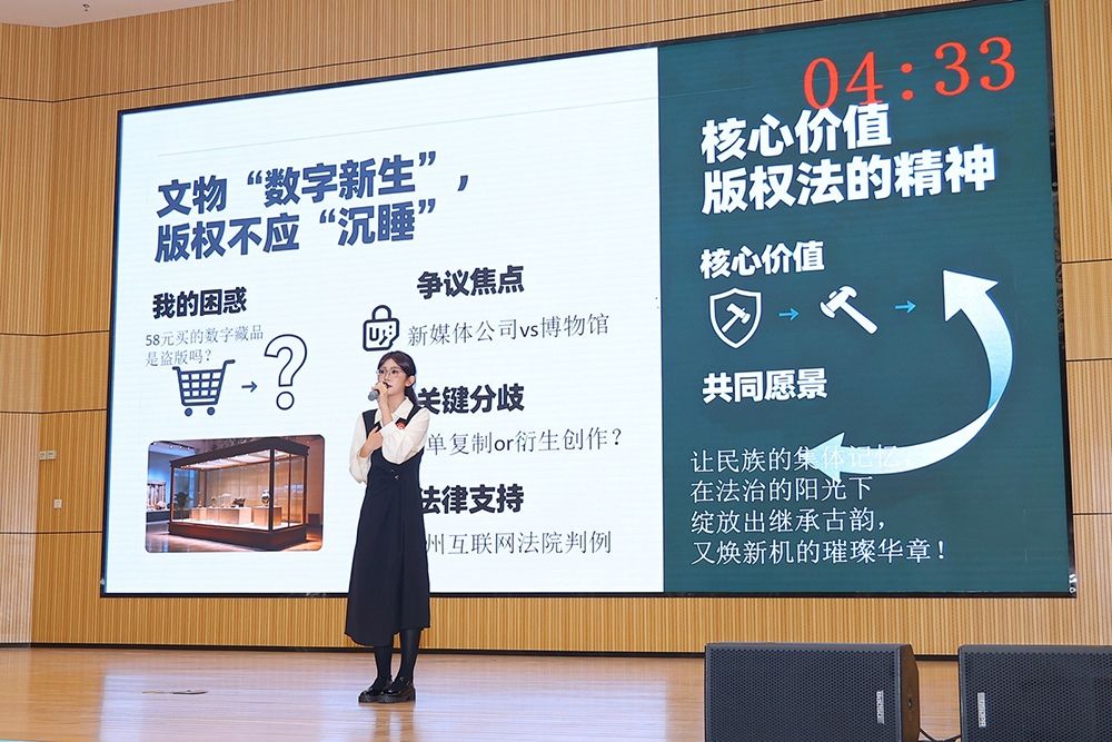 比赛中,文希同学以广东非遗美食为切入点,阐释版权对传统文化创新的保护作用;林嘉莹同学以数字文物“皇后之玺”为例,探讨文化遗产数字化中的版权保护机制;姚欣雨同学结合亲身经历,分析人工智能训练与版权边界问题。三位同学的演讲紧扣时代脉搏,主题鲜明、见解独到,展现了汕大学子的思辨风采与时代关怀。