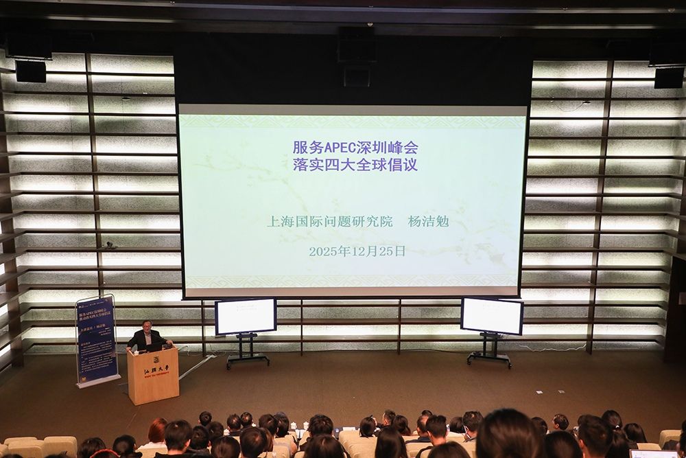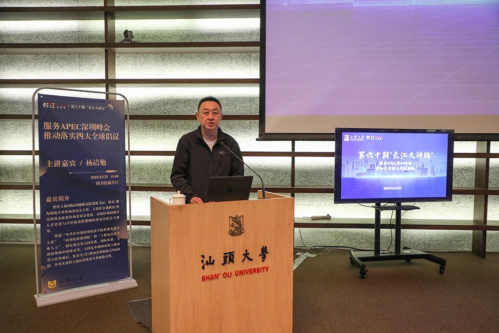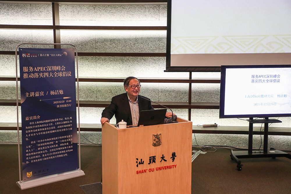 为深入学习领会习近平外交思想,推动汕头大学区域国别学科建设与咨政服务能力提升,更好服务国家重大主场外交战略,为APEC深圳峰会贡献高水平智力支撑,12月25日下午,汕头大学第六十期“长江大讲坛”在桑浦山校区图书馆报告厅举行,上海国际问题研究院学术咨询委员会主任杨洁勉教授以“服务APEC深圳峰会、落实四大全球倡议”为题作专题讲座。校领导,文学院、法学院、商学院、马克思主义学院等文科学院师生代表等近200人参加讲座。汕头大学党委书记唐锐主持会议并作总结讲话。