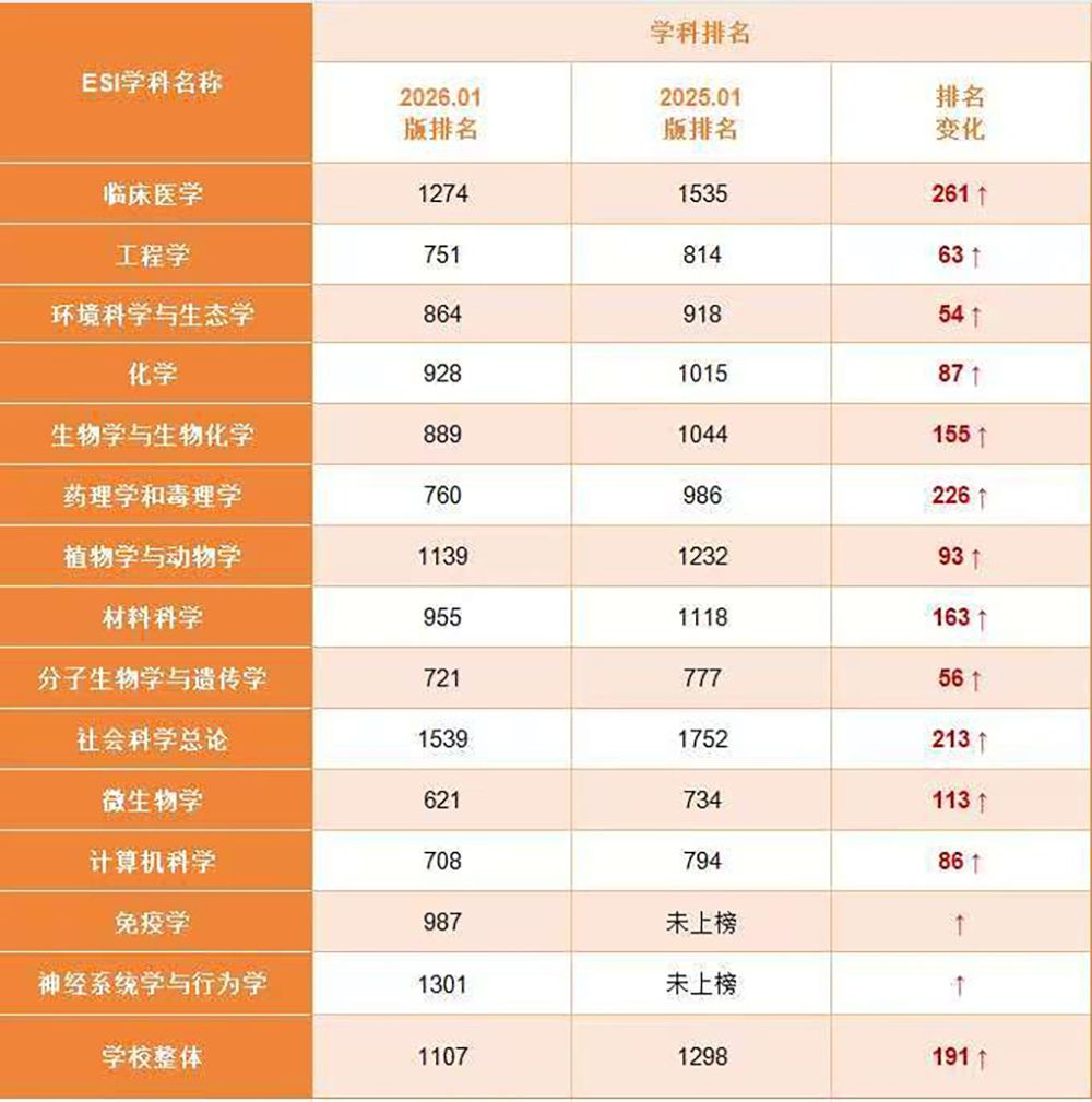 汕大原有12个ESI前1%学科全部实现排名进位,其中6个学科进步超过100位,展现出扎实的学科基础和持续的发展动能。免疫学、神经科学与行为学的首次入围,标志着学校在医学与生命科学领域的布局已见成效,学科生态更趋完善。