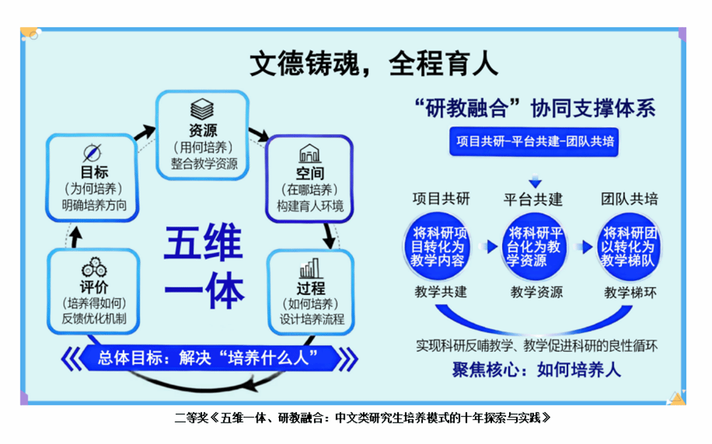 本成果以“五维一体”重新锚定研究生培养框架,破解“培养目标模糊化、创新动力不足”问题。从目标(为何培养)、资源(用何培养)、空间(在哪培养)、过程(如何培养)、评价(培养的如何)这五个维度来聚焦“培养什么人”这一核心,并健全“文德铸魂、全程育人”的体系。同时,成果以“研教融合”构建协同支撑体系,突破“培养模式同质化、保障机制薄弱”瓶颈。通过“项目共研-平台共建-团队共培”三大机制变革,聚焦“如何培养人”这一核心。具体而言,通过科研项目转化为教学内容(项目共研)、科研平台转化为教学资源(平台共建)、科研团队转化为教学梯队(团队共培),以此实现“科研反哺教学、教学促进科研”的良性循环。