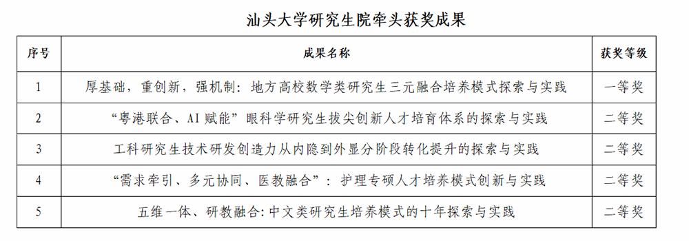 近日,2025年度全省学校(高等教育)优秀教学成果奖评选结果公布。汕头大学作为第一完成单位,5项研究生教育教学成果获奖,其中一等奖1项、二等奖4项,实现学校在省级研究生教学成果奖项上“零的突破”。