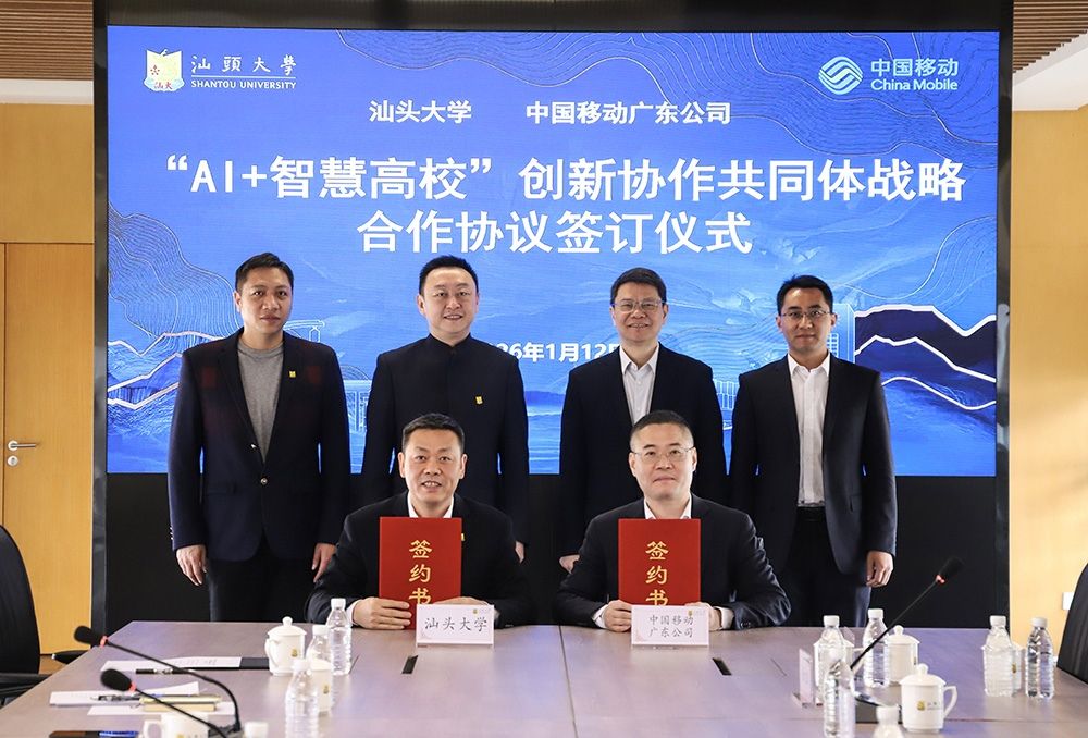 1月12日,汕头大学与中国移动广东公司正式签署“AI+智慧高校”创新协作共同体战略合作协议。汕头大学党委书记唐锐,党委常委、副校长喻洪,中国移动广东公司党委书记、总经理葛松海,党委委员、副总经理周忠坤,中国移动广东公司汕头分公司党委书记、总经理杨勇等领导出席活动。活动由喻洪主持。