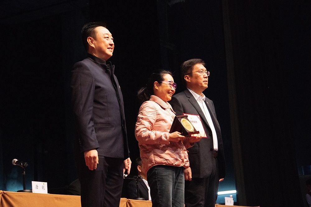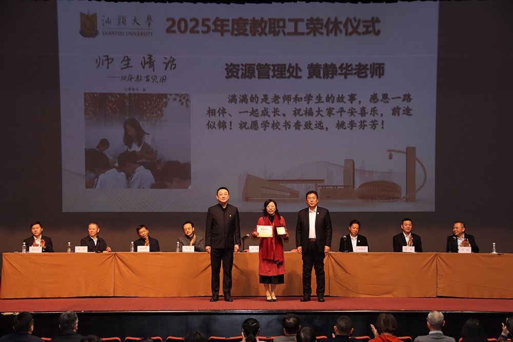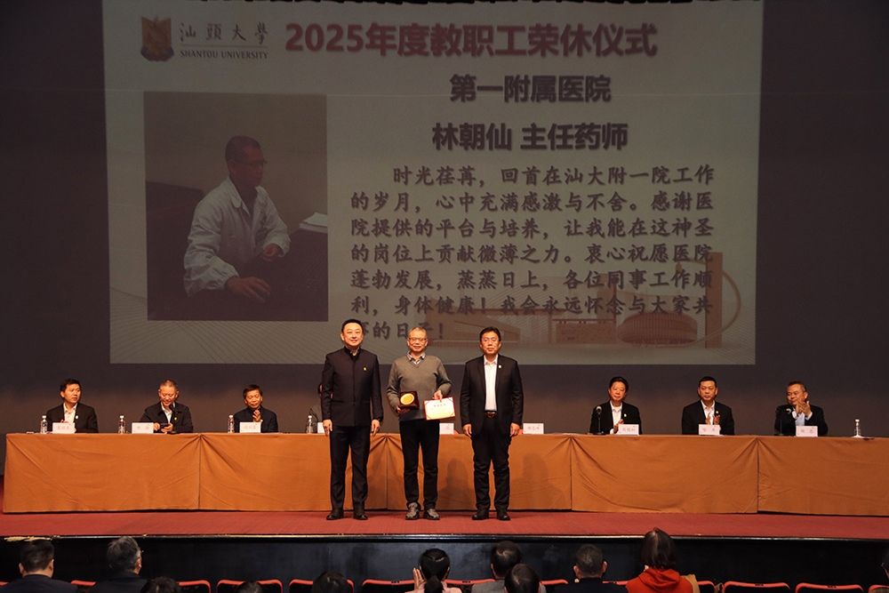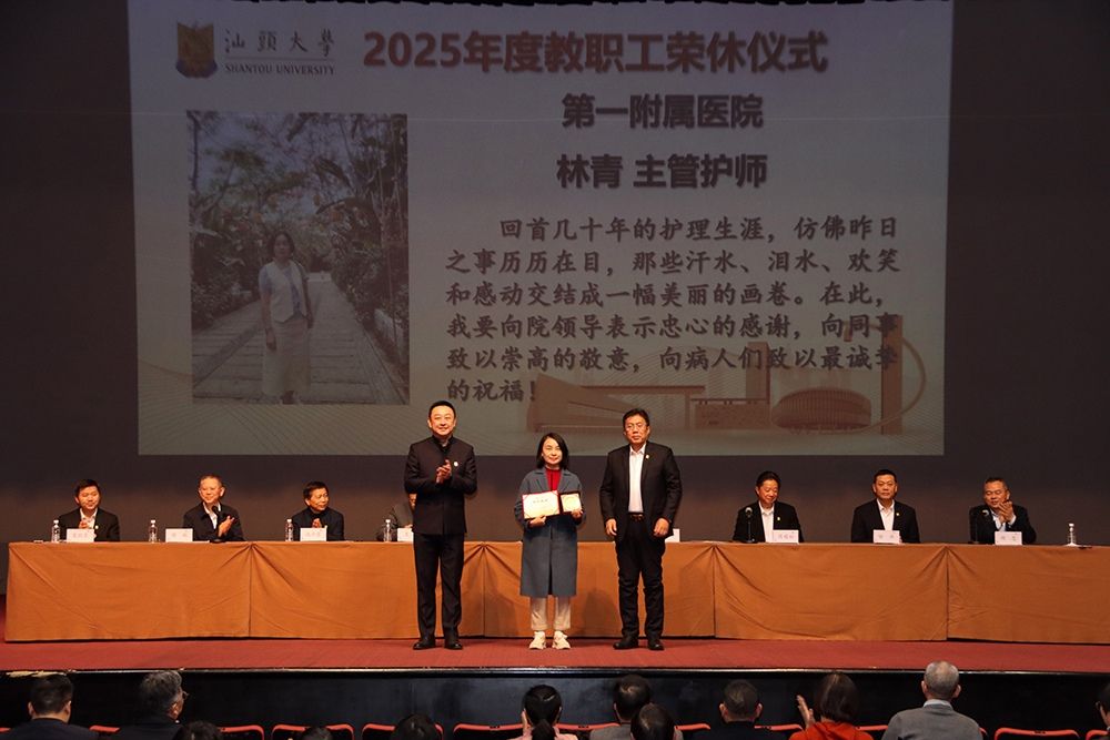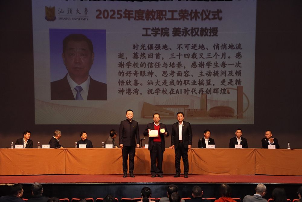 会上,学校为达到退休年龄的教职工举行了一场庄重而温馨的荣休仪式。2025年,学校共有109人荣休。唐锐和校党委副书记、校长郝志峰为到场的荣休教职工颁发纪念章及证书,代表学校致以最衷心的感谢和最真挚的祝福。