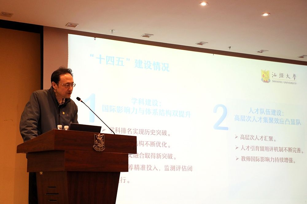 “为何要‘人人参加一次学科竞赛(竞争)’”“为何要院院申博、专专有硕”“新一轮‘双一流’高校建设,汕大何为……”从一系列问题出发,郝志峰系统总结了“十四五”期间学校取得的令人振奋的突破、大幅跃升的数据和含金量十足的荣誉。他指出,“十四五”期间,学校强化政治引领,党建赋能学校卓越发展;深化治理改革,构筑中国特色现代大学制度体系;优化学科生态系统,构筑战略竞争新优势;重构育人体系,培养拔尖创新人才;创新人才工作机制,构筑区域人才高地;创新科研组织模式,赋能高质量发展新范式;彰显服务担当,构建校地共生共荣新范式;深化开放办学战略,构建国际化发展新格局;强化战略资源保障,夯实高水平大学发展根基,取得了一系列标志性成果:14个ESI前1%学科、2个前2‰学科、2个前5‰学科、11名教师入选“中国高被引学者”、37位学者入选全球前2%顶尖科学家榜单、国家社科基金重大项目及前沿生物技术专项等领域实现历史性突破……