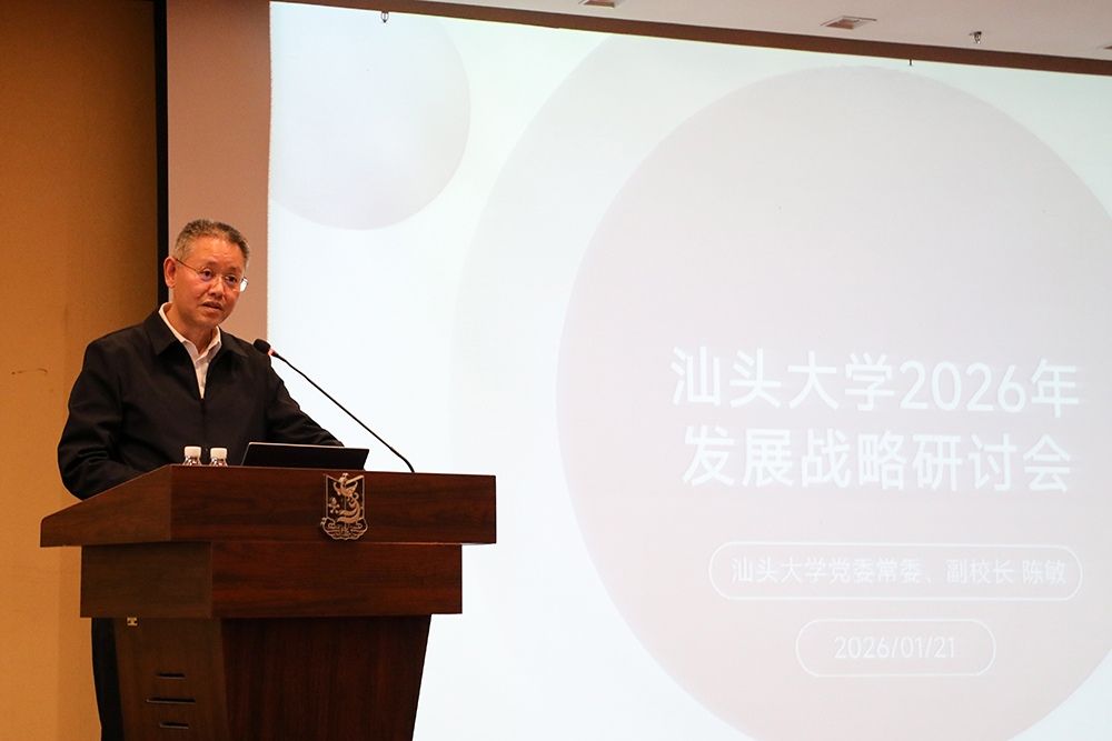 1月20日至22日,汕头大学2026年发展战略研讨会在桑浦山校区召开。会议深入学习贯彻习近平总书记关于教育的重要论述,全面贯彻党的二十大和二十届历次全会精神以及全国教育大会精神,贯彻落实《教育强国建设规划纲要(2024—2035年)》和《加快建设教育强国三年行动计划(2025—2027年)》战略部署,围绕“总结‘十四五’、谋划‘十五五’”主题进行战略研讨,通过校领导专题报告、专家讲座、分组研讨等议程,锚定学校未来五年改革方向,明确核心工作思路。全体校领导,校本部各管理部处、教学教辅单位正副职,医学院和附属医院副处级以上干部,三级以上教授、省部级及以上人才,各民主党派、无党派人士代表参加会议。