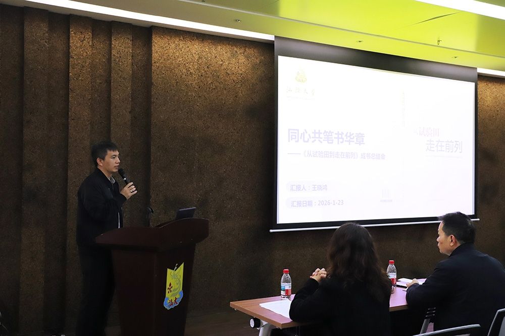 党委宣传统战部副部长王晓鸿首先作《纪实》编撰工作总结。他详细回顾了该书从框架搭建、思路调整,到资料搜集、细节打磨的成书历程。他指出,在时间紧、任务重的双重压力下,编撰团队主动探索新路径,按时高质量完成了编撰任务。同时,他系统总结了编撰工作的宝贵经验:一是坚持目标导向与标准化管理并行,筑牢工作根基;二是强化团队协作与跨部门联动,凝聚工作合力;三是建立可追溯、闭环化的工作流程,提升工作质效。