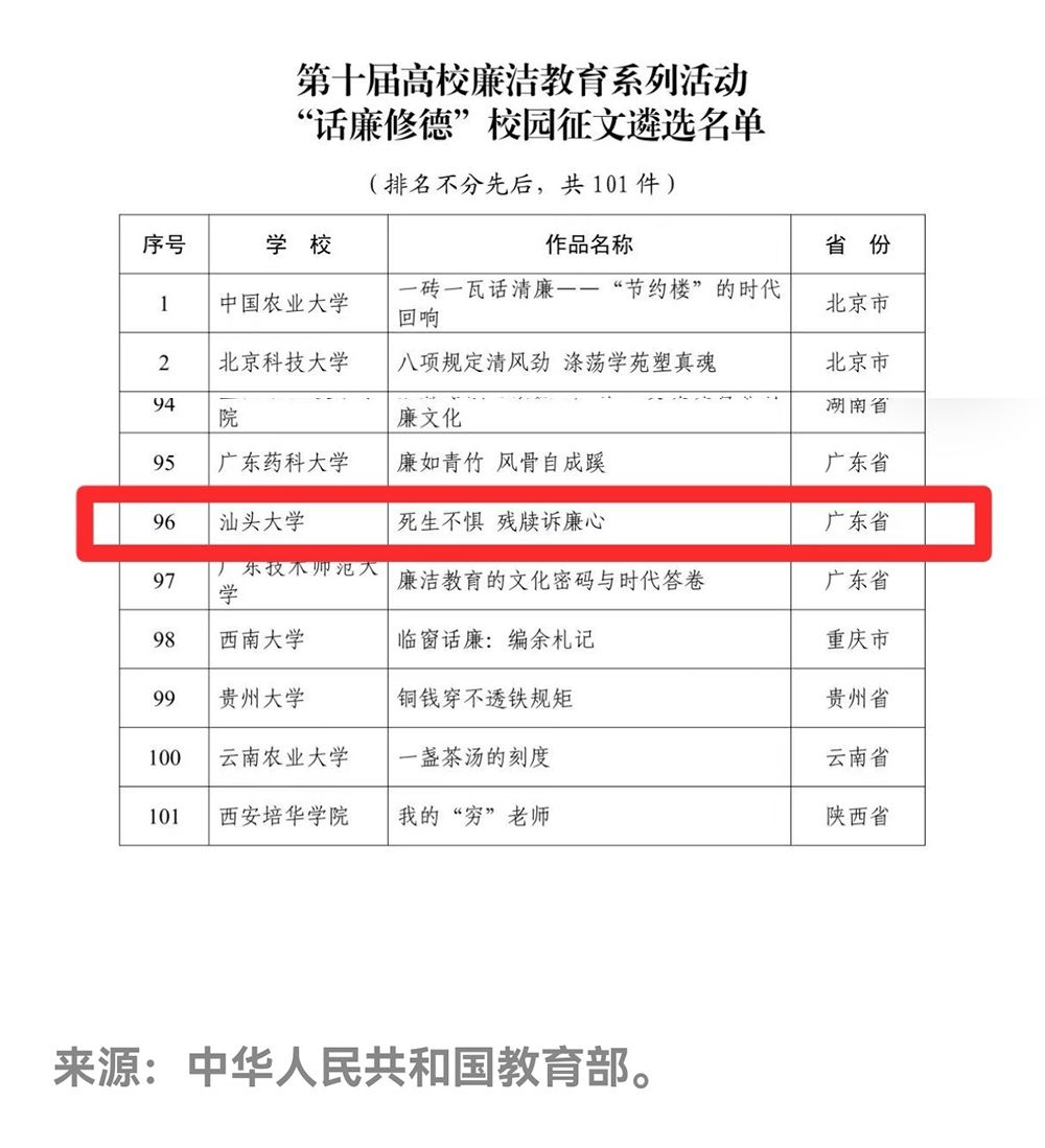 近日,教育部公布第十届高校廉洁教育系列活动结果公示,汕头大学推荐的征文作品《死生不惧,残牍诉廉心》成功入选“话廉修德”校园征文遴选名单。