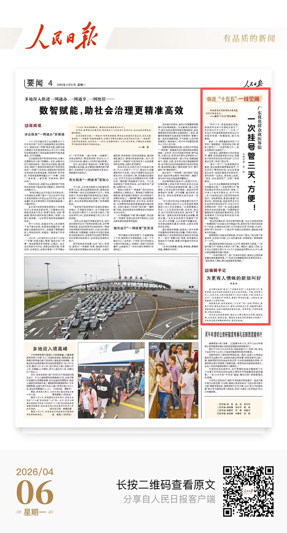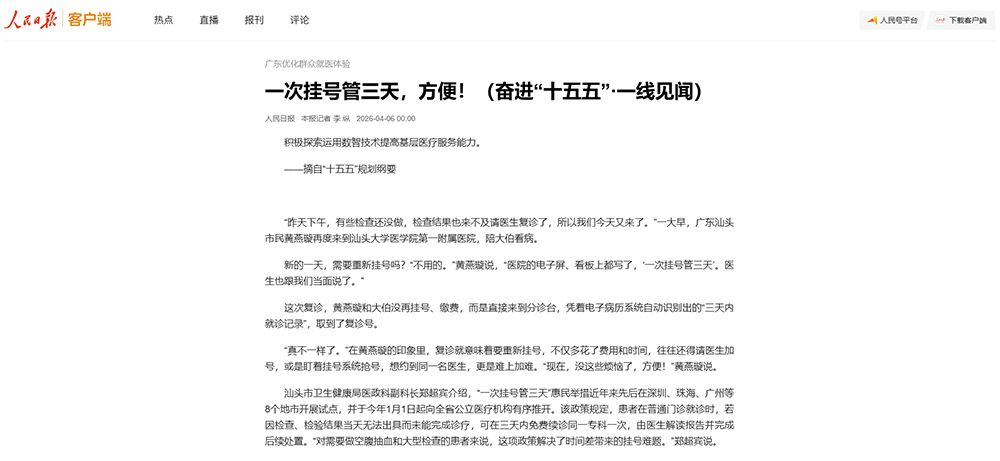 近日,汕头大学医学院第一附属医院经验“一次挂号管三天”获《人民日报》要闻版刊发,现将全文转载如下: