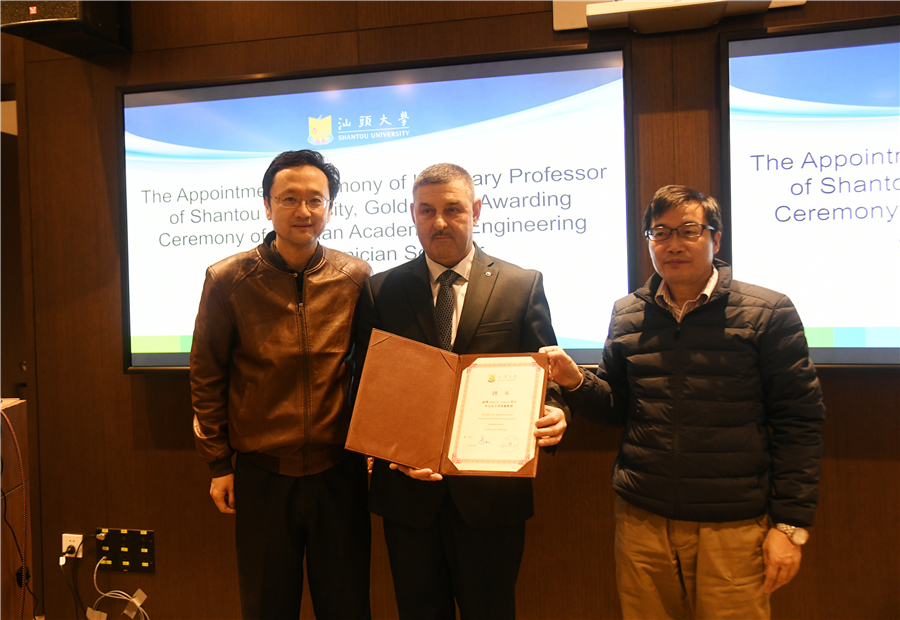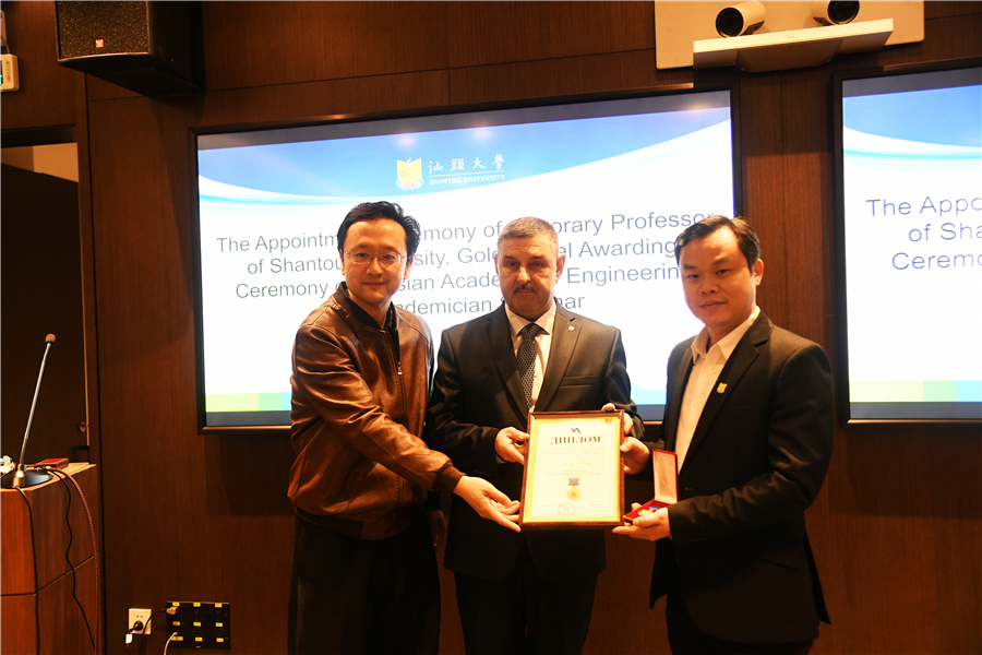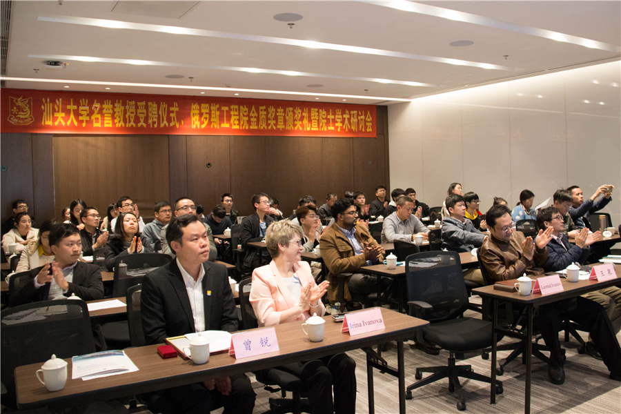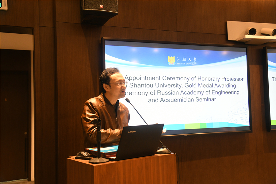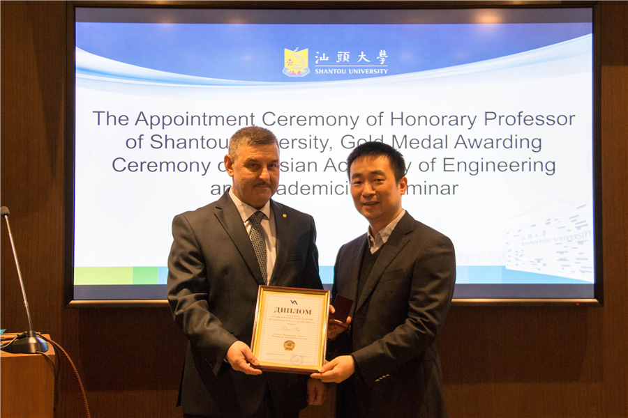 12月12日上午,“汕头大学名誉教授受聘仪式、俄罗斯工程院金质奖章颁奖礼暨院士学术研讨会” 在汕头大学学术交流中心举行。本次会议由汕头大学主办,邀请了俄罗斯工程院副院长兼秘书长Leonid Ivanov院士及其夫人Irina Ivanova女士出席,旨在加强汕头大学与俄罗斯工程院在相关学科领域的交流与合作。会议由工学院电子系主任范衠教授主持,汕头大学执行校长王泉院士、工学院院长沈水龙教授、国际交流合作处处长曾锐以及汕头大学的师生代表等70余人参加了本次会议。