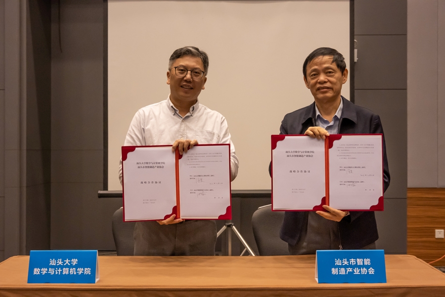 随后,数学与计算机学院和汕头市智能制造产业协会举行合作签约仪式。双方将在人才培养、成果转化、前沿战略咨询、技术产品领域等开展合作,共同为区域工业企业数字化转型提供技术指导和智力支持。