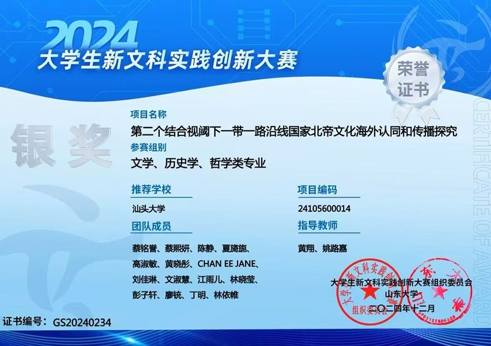 2024年2月,由教育部高教司指导,山东大学主办的“浪潮杯”2024年大学生新文科实践创新大赛全国总决赛在山东济南举行。汕头大学长江新闻与传播学院黄翔博士、泰国格乐大学姚路嘉教授指导的学生团队入围全国总决赛,《第二个结合视阈下“一带一路”沿线国家北帝文化海外认同与传播探究》项目斩获银奖。