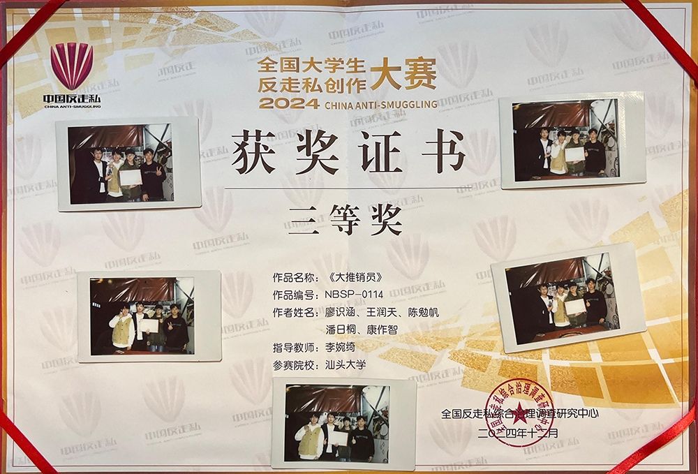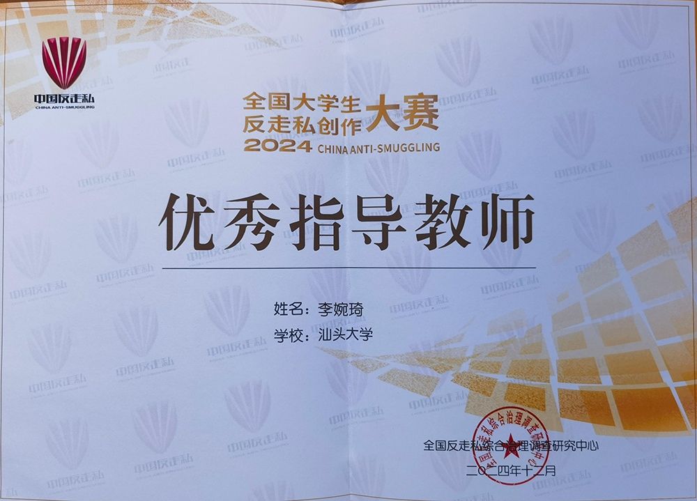 2024年12月,由全国打击走私综合治理办公室指导、全国反走私综合治理调查研究中心主办的第三届全国大学生反走私创作大赛获奖名单公布。汕头大学长江新闻与传播学院李婉琦博士带领学生团队完成的作品《大推销员》斩获全国大学生反走私大赛全国三等奖、广东省一等奖。李婉琦获评优秀指导教师。