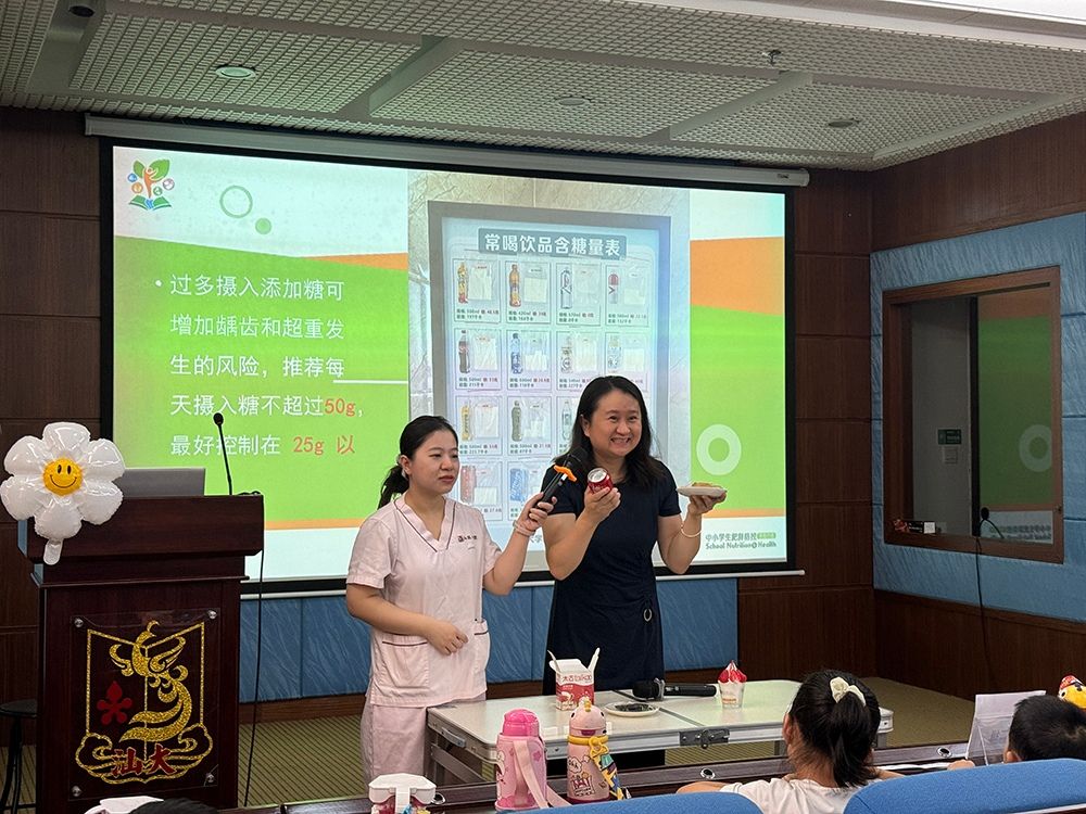 活动伊始,汕头大学医学院第一附属医院临床营养科陈馥副主任为家长和孩子带来了一场生动的科普讲座。陈馥以“生活中的甜蜜陷阱”为主题,通过糖块展示了饮料的含糖量,让家长和孩子直观感受到隐形糖的危害。同时,陈馥现场解读了营养标签、分享了如何自制健康饮品,并教会家长快速识别食品健康风险,帮助家长将膳食管理转化为可操作的日常实践。