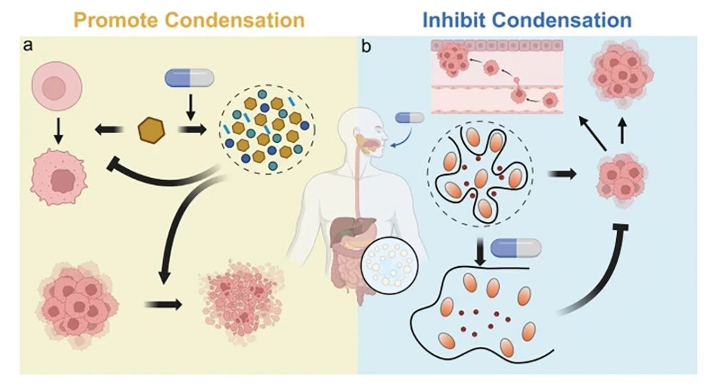 靶向“液滴”:癌症治疗的新曙光正是由于相分离在癌症中的重要作用及其内在的可塑性和对环境的高度敏感性,针对异常相分离凝聚体的治疗策略展现出巨大潜力。综述中总结了两大类策略:1促进相分离利用小分子促使特定蛋白被“困”在凝聚体中无法发挥致癌功能,或诱导其形成固态聚集从而失活。2抑制相分离开发小分子抑制剂破坏致癌转录凝聚体的形成或破坏应激颗粒进而逆转肿瘤的耐药性。此外,PROTAC技术、纳米材料等新兴手段也正被用于精准调控肿瘤相关的相分离过程。