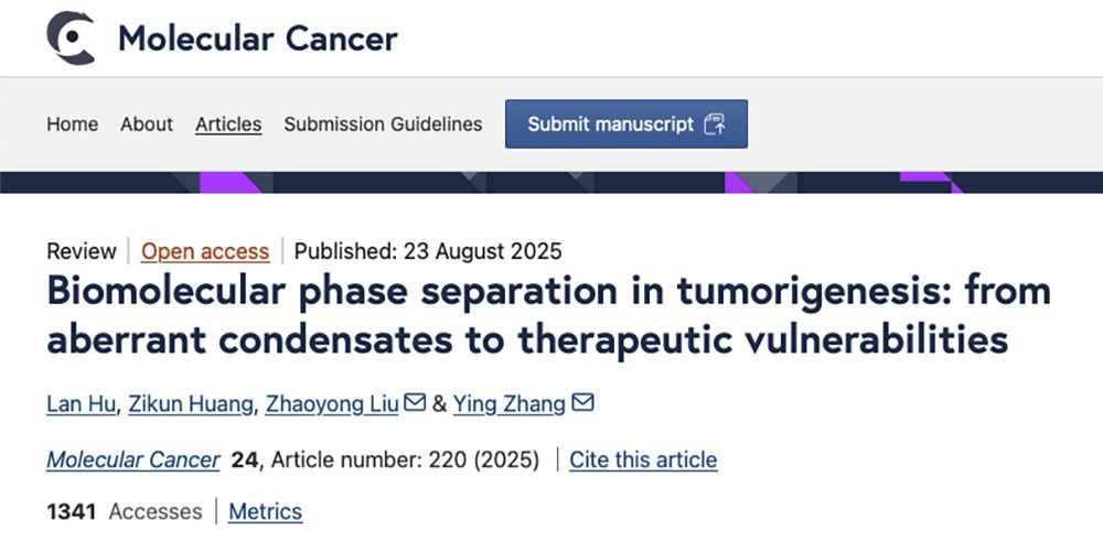 近日,汕头大学医学院附属肿瘤医院张莹副研究员团队联合汕头大学第一附属医院刘钊勇副主任医师团队,在国际肿瘤相关权威期刊Molecular Cancer(中国科学院一区期刊,近五年平均影响因子35.9)上合作发表题为《Biomolecular phase separation in tumorigenesis: from aberrant condensates to therapeutic vulnerabilities》的高水平综述。该综述全面总结了生物大分子相分离在癌症生物学中的调控因素和功能机制,特别关注其在多种肿瘤标志性特征形成过程中的作用。同时,总结了新兴的针对相分离凝聚体的治疗策略,以期为开发新的治疗方案提供启发。