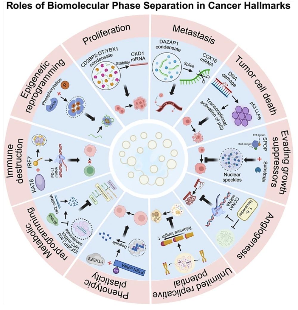 在正常细胞中,相分离是维持基因表达稳态、应激适应和代谢平衡的重要机制。然而,在癌细胞中,基因突变、基因融合、翻译后修饰及环境压力等多种因素会导致相分离失控,从而影响癌细胞存活。这些异常相分离过程几乎涉及癌症的十大标志性特征。