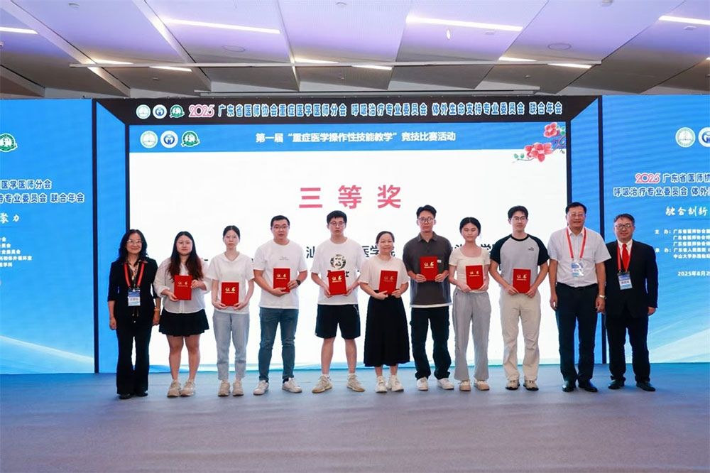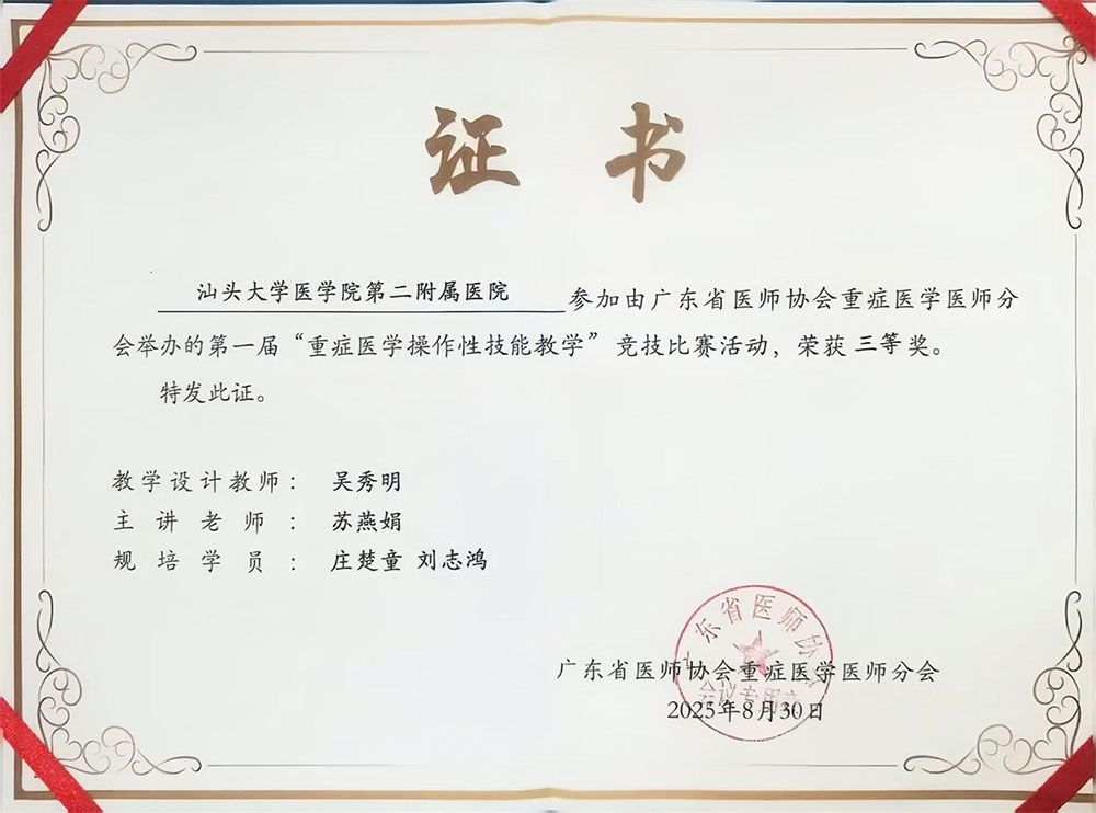 近期,在广东省医师协会重症医师分会主办的第一届“重症医学操作性技能教学”竞技比赛中,由汕头大学医学院第二附属医院(以下简称附二院)重症医学科吴秀明主任医师指导,苏燕娟主治医师带领医院二年级规培医师刘志鸿、三年级规培医师庄楚童组成的团队,凭借扎实的理论功底、精湛的临床操作、卓越的团队协作和冷静的临场应变能力,在众多强劲对手中脱颖而出,一举斩获大赛团体三等奖的殊荣,充分展现了附二院重症医学教学的实力与风采。